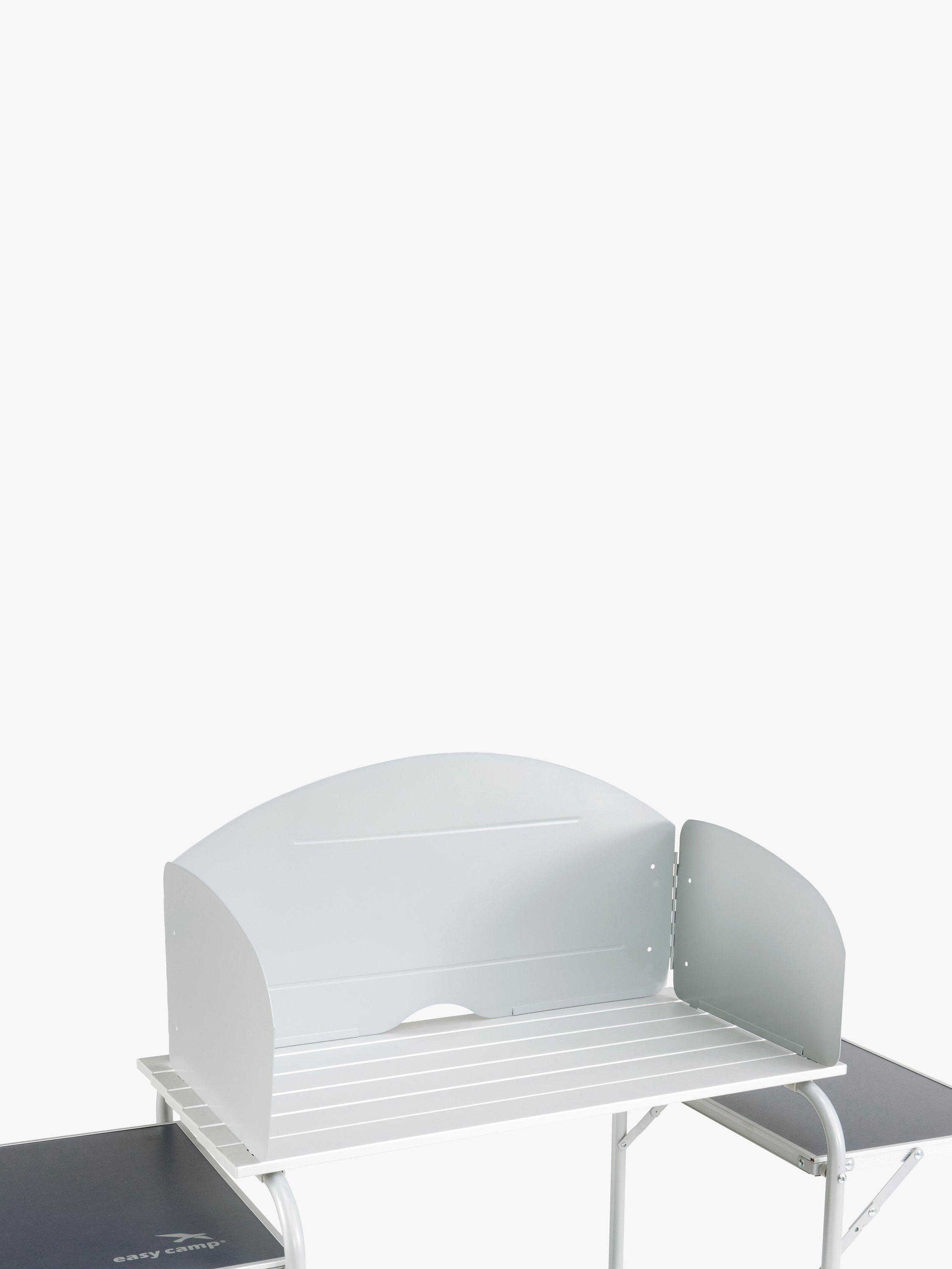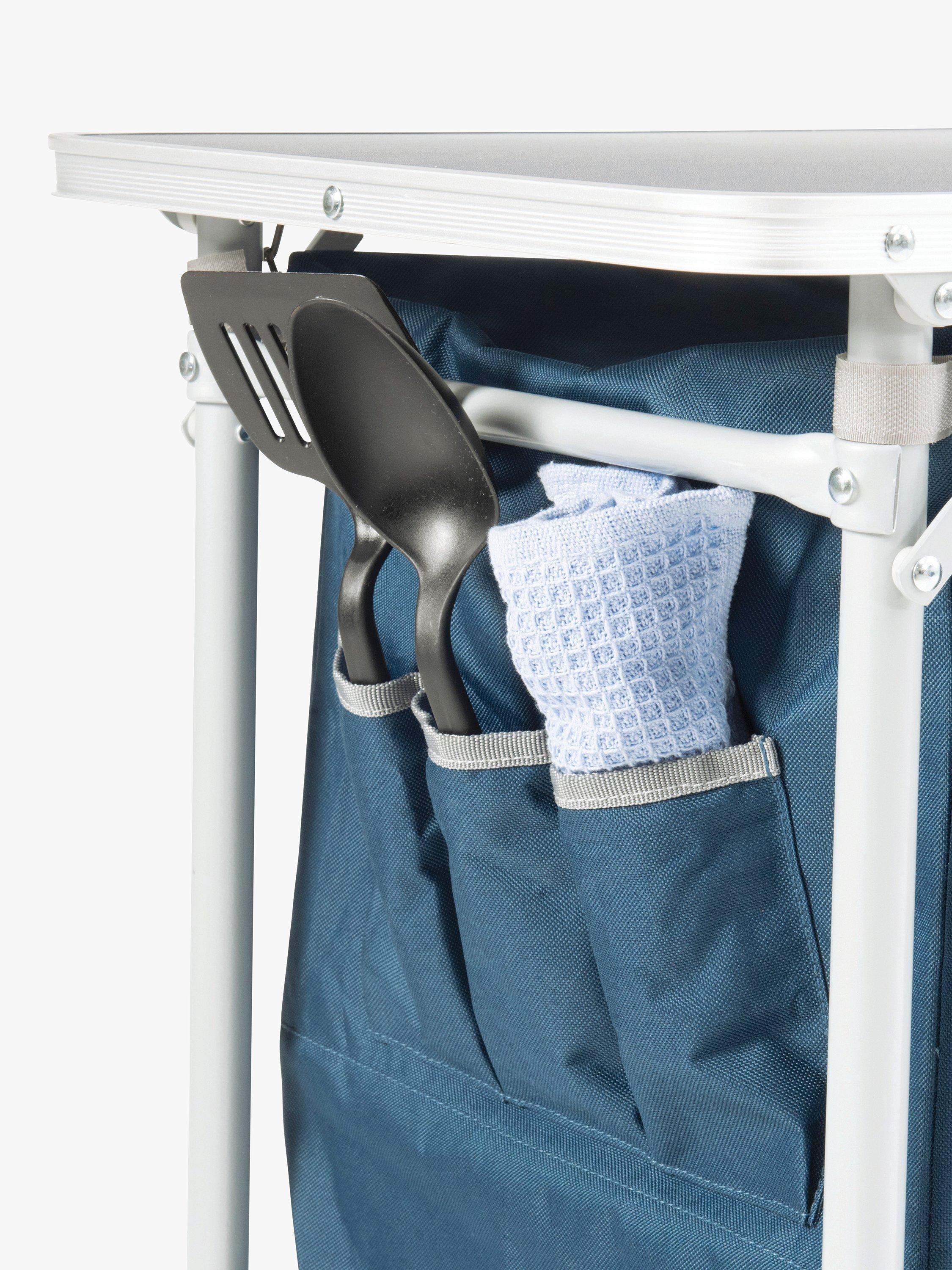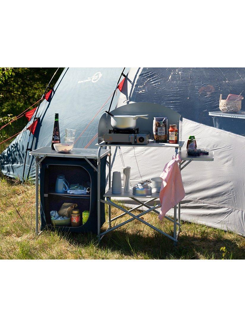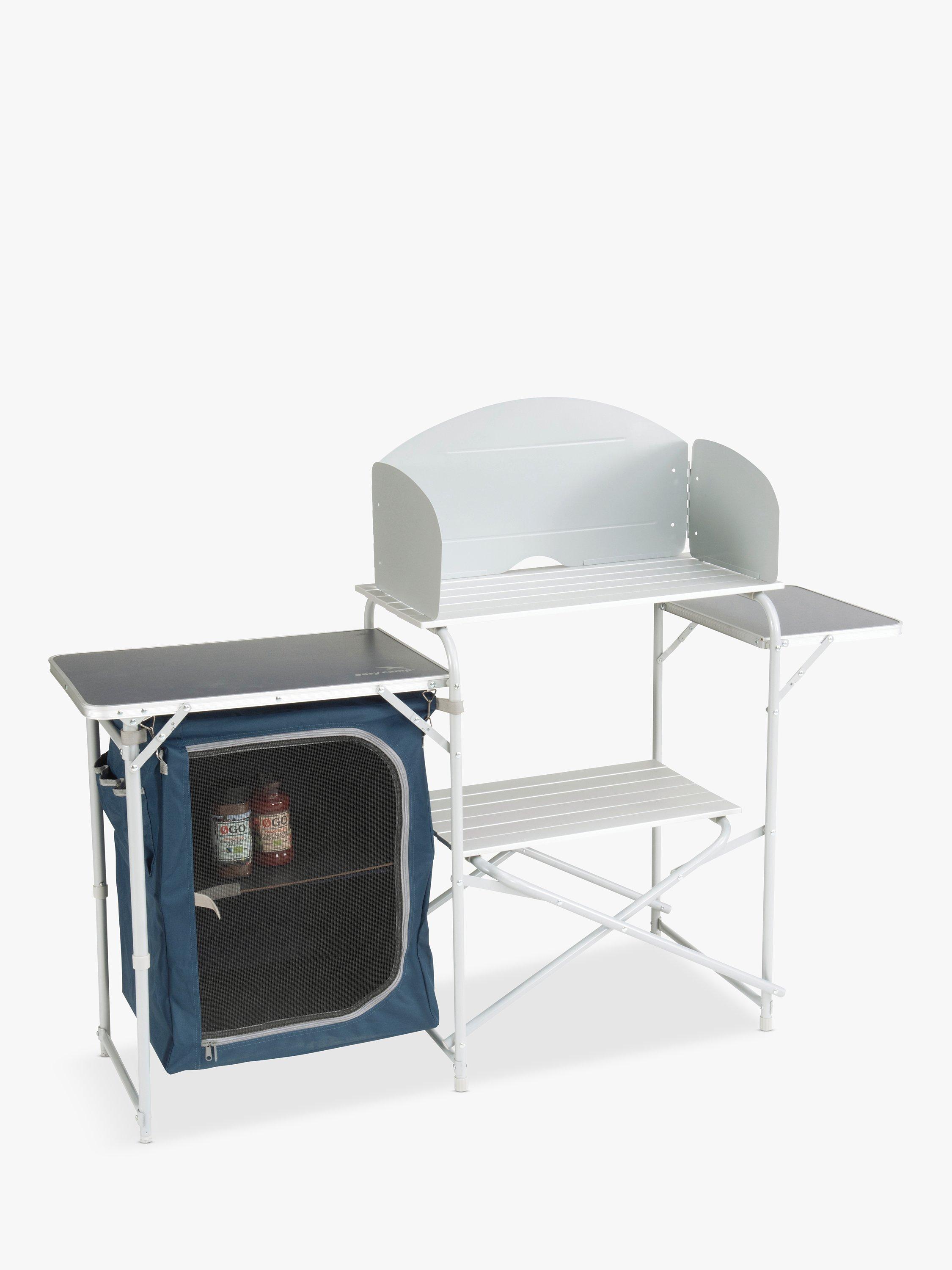 This table features a stable steel frame, side tables, a windshield, a lower shelf, along with a cupboard with shelves. The table is simple to set up and packs away neatly into its own carry bag for transport and storage.