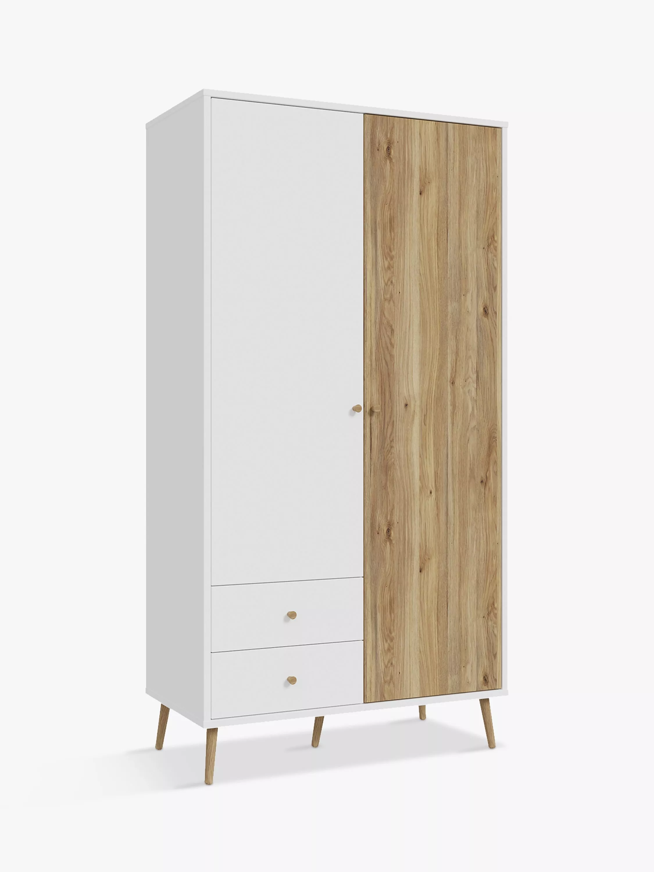 The design is contemporary, yet evoking the best of mid-century design. Designed in an oak effect and subtle in form and colour, the furniture combines beauty and functionality. All models have solid wood, tall, slightly angled and tapered legs. Delicate wooden knobs emphasise the collection's style and are perfectly matched to the various colour options. The furniture will be a wonderful foundation for arranging a comfortable living room or bedroom in a Scandinavian, boho, or retro spirit.