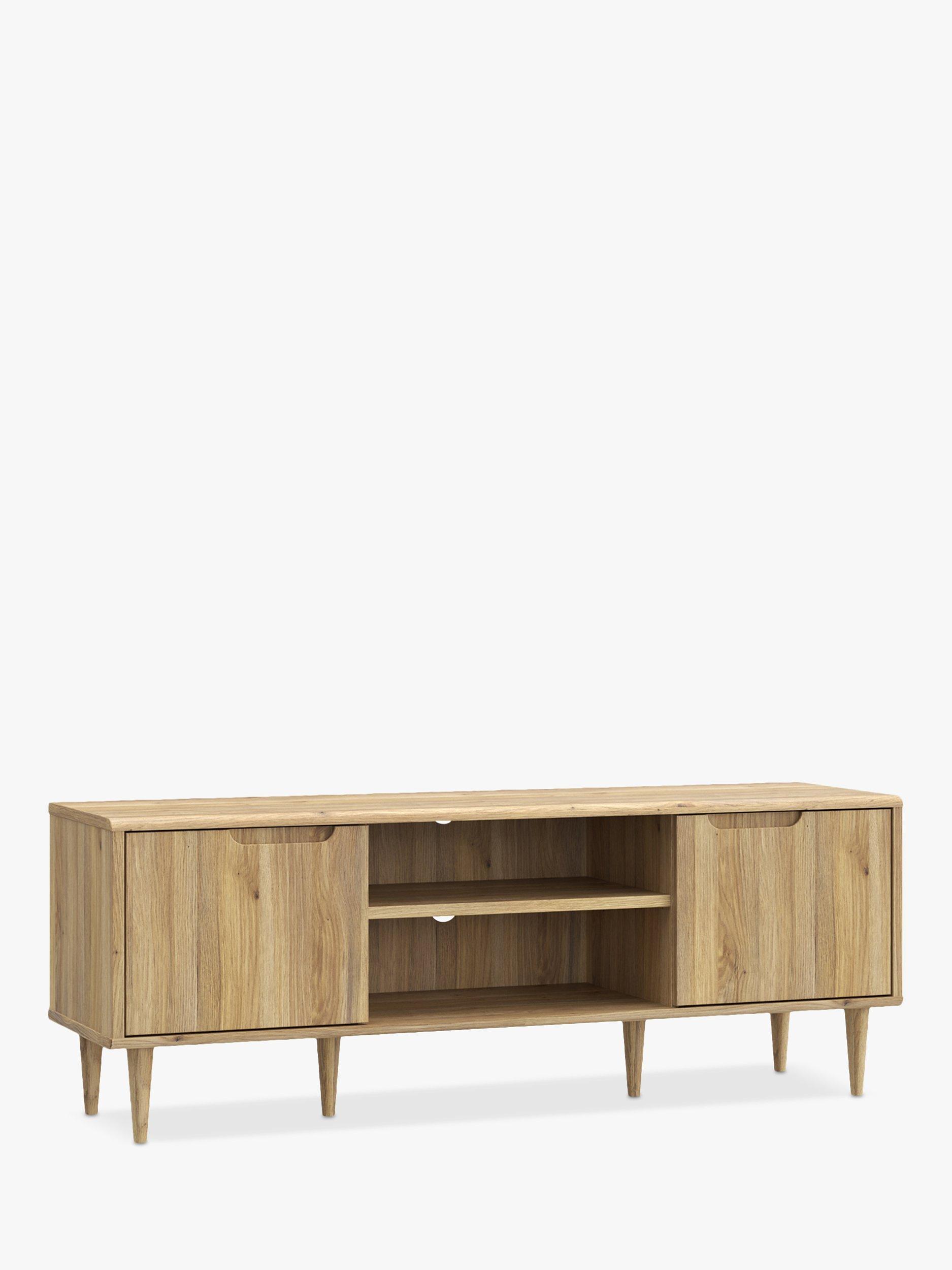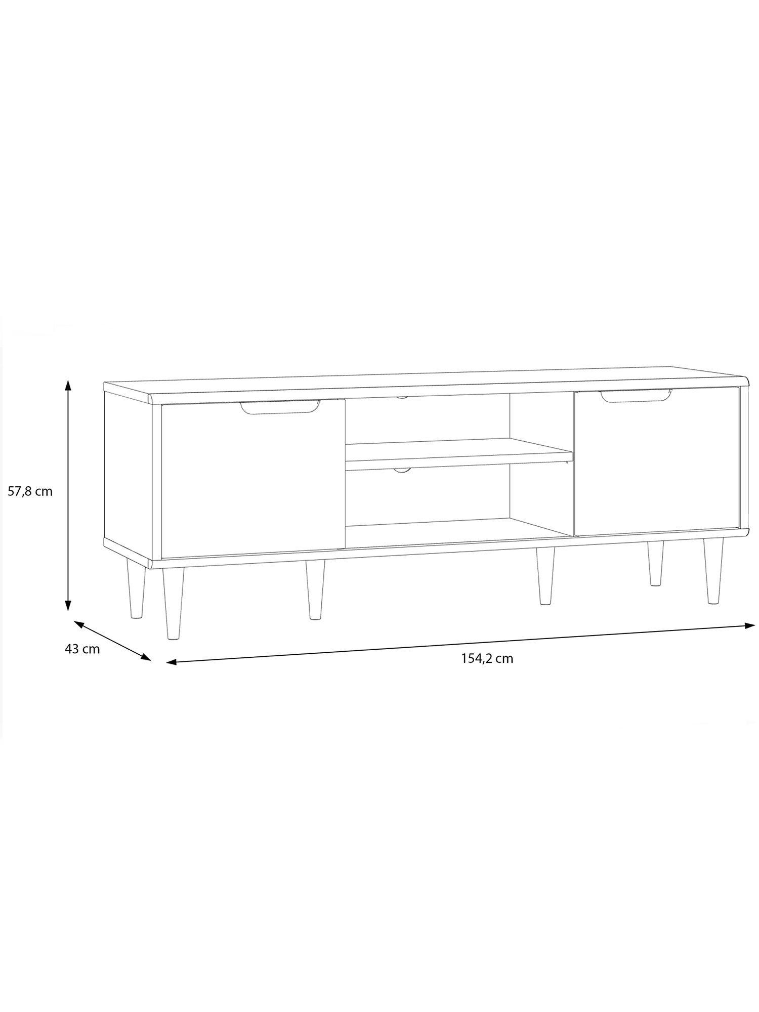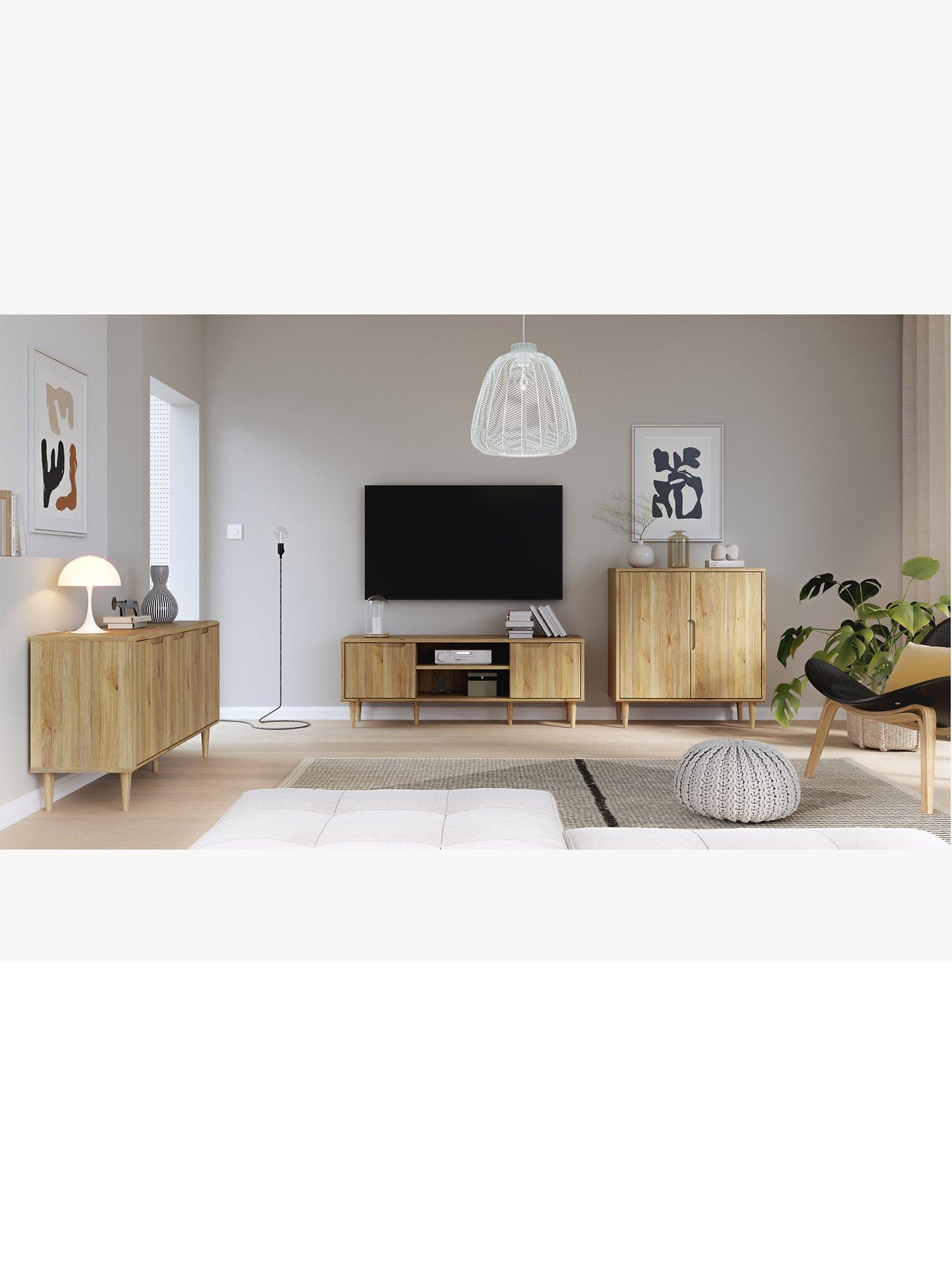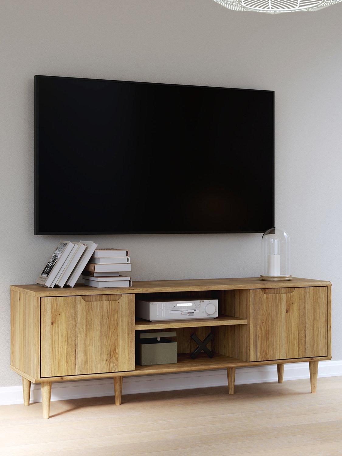 The Sherbrooke TV unit allows you to create a space for a comfortable cinema at home. It features convenient open shelves and two closed cabinets, along with openings in the rear panel for cable organisation and airflow.