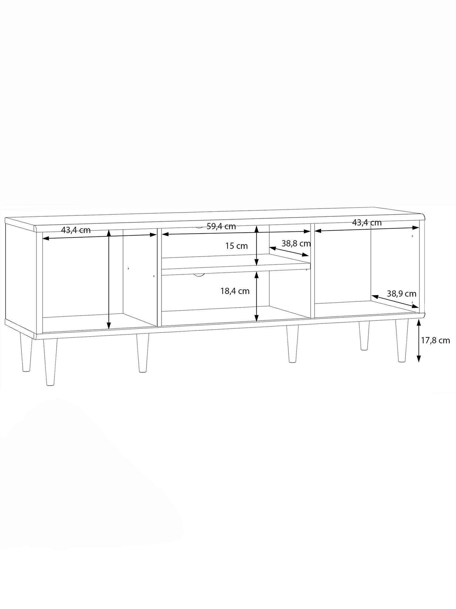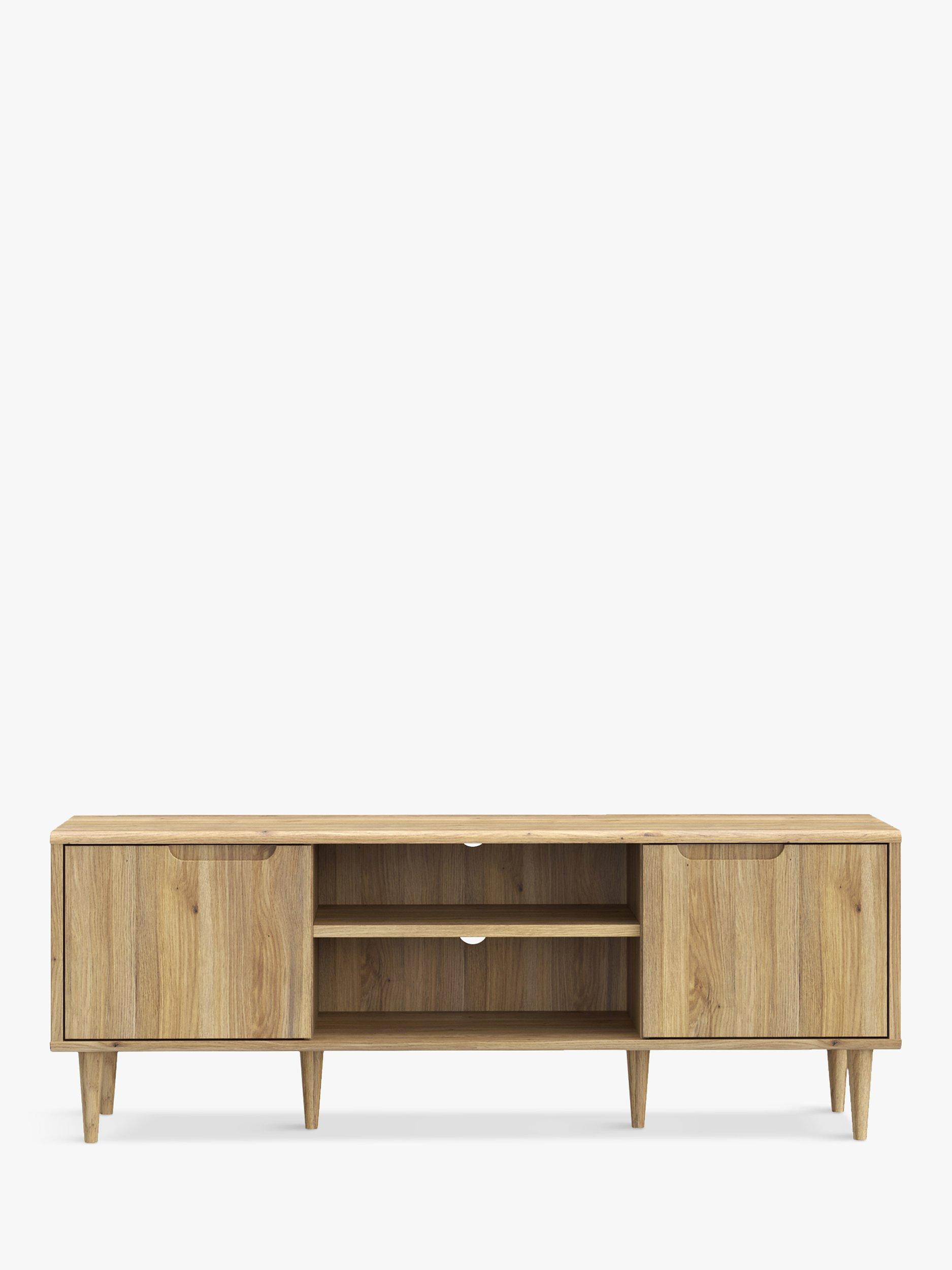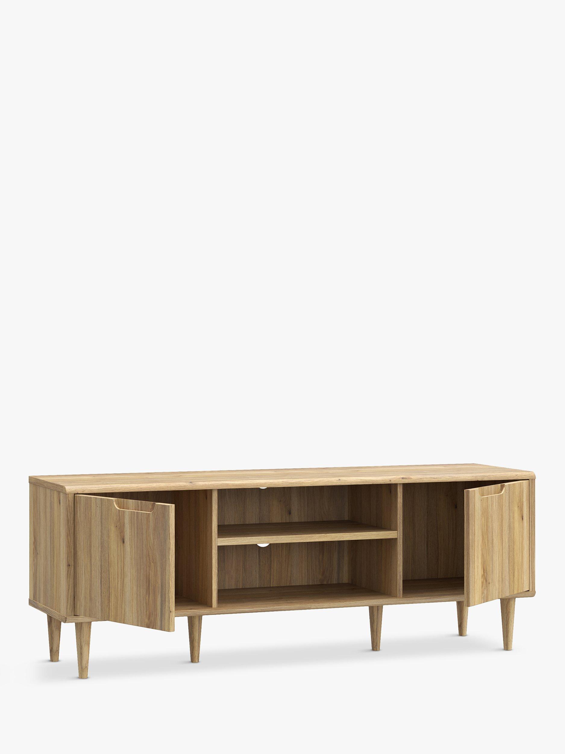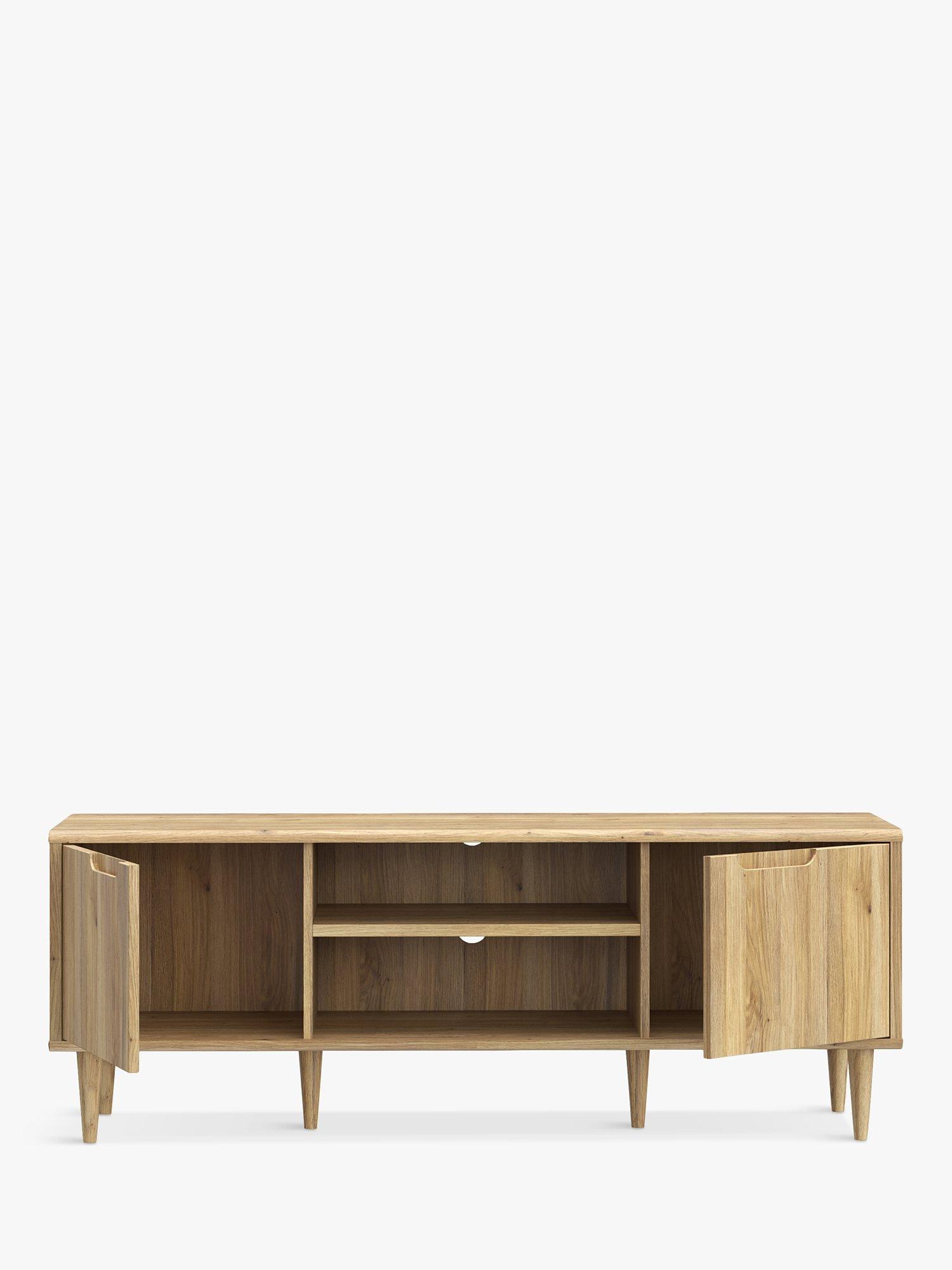 The Sherbrooke TV unit allows you to create a space for a comfortable cinema at home. It features convenient open shelves and two closed cabinets, along with openings in the rear panel for cable organisation and airflow.