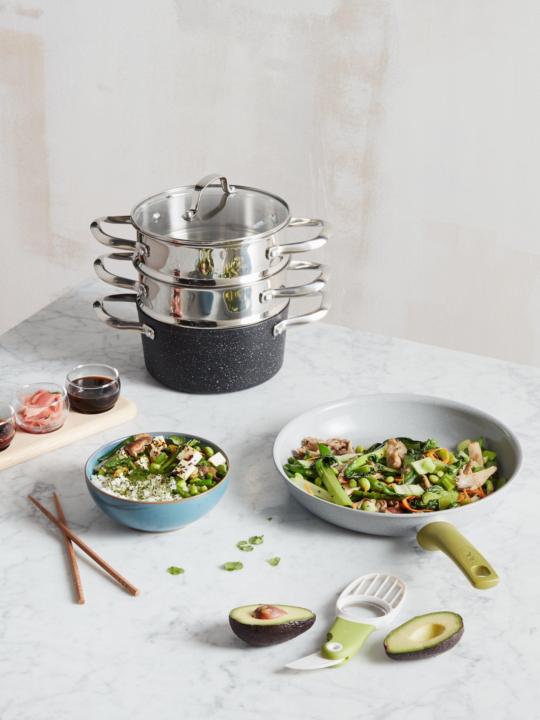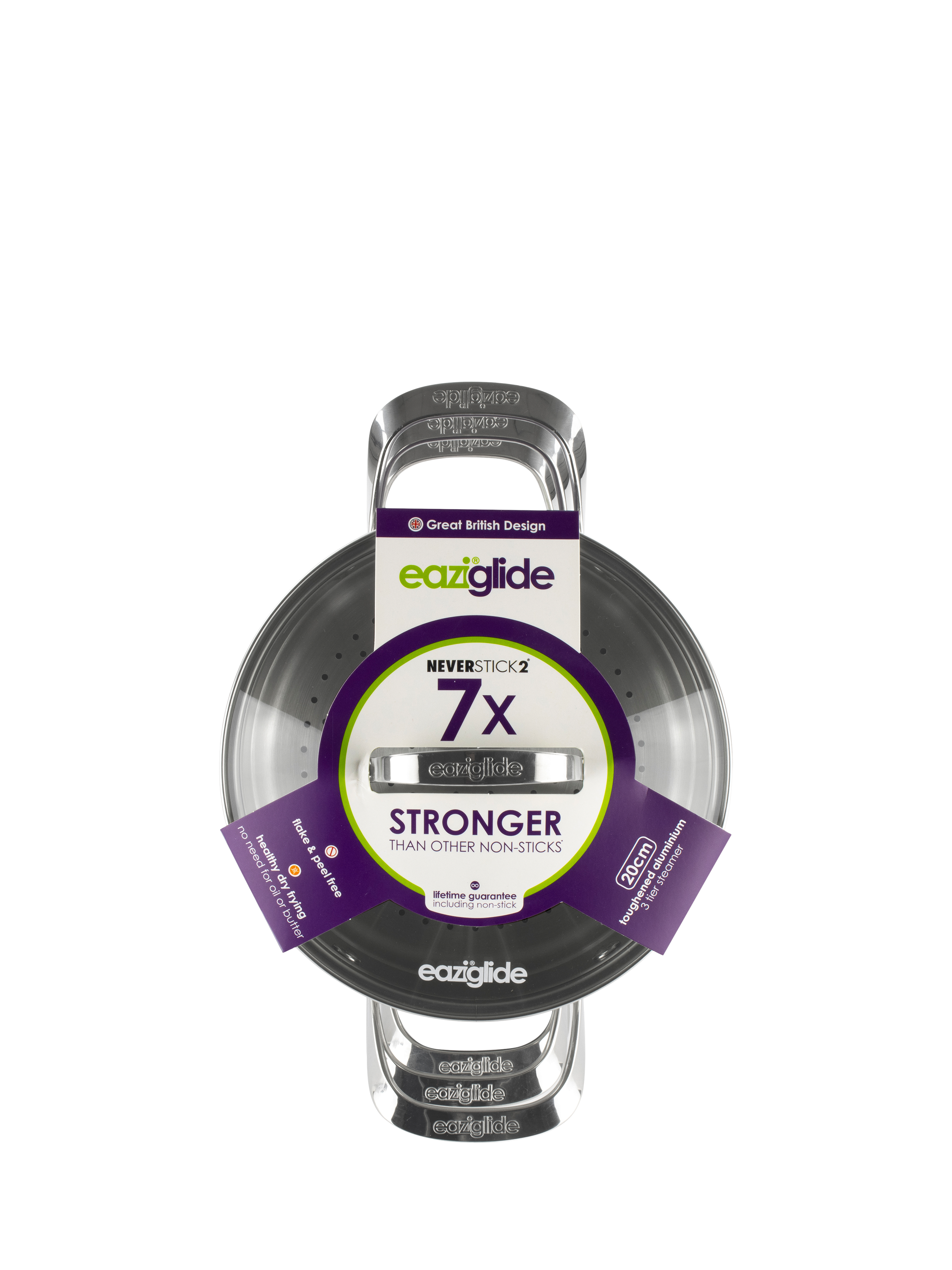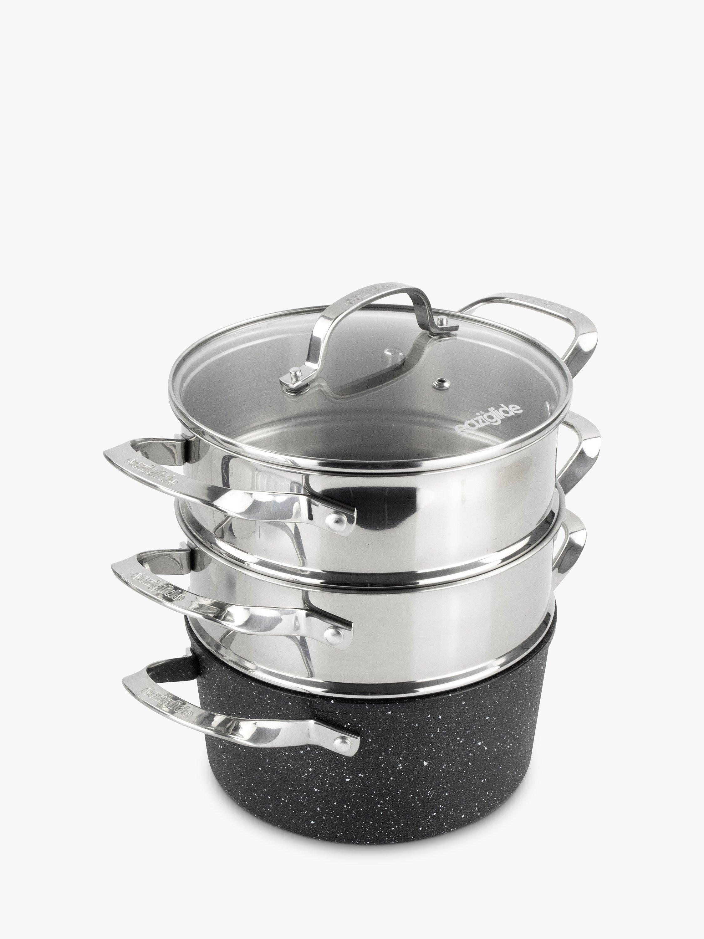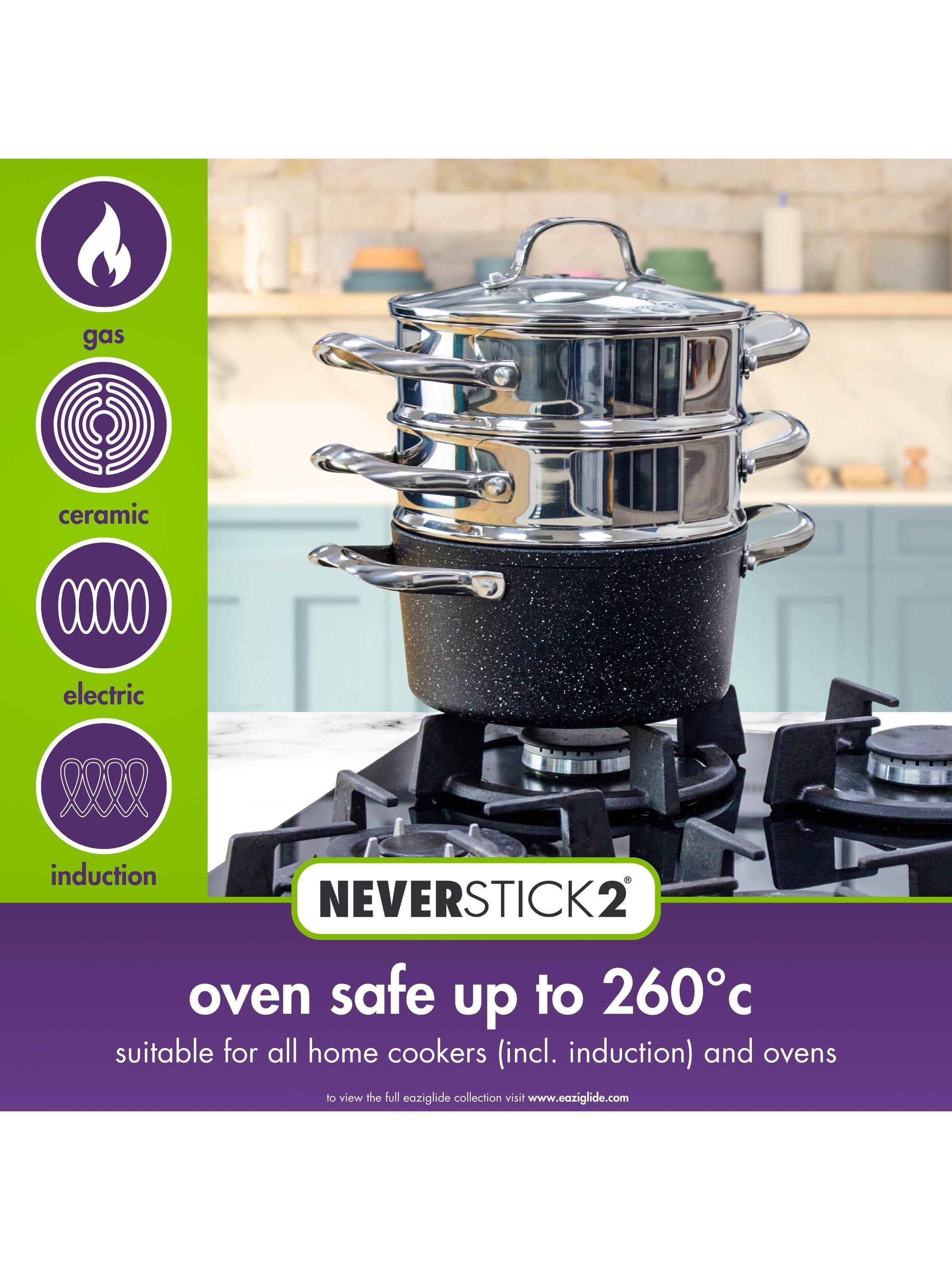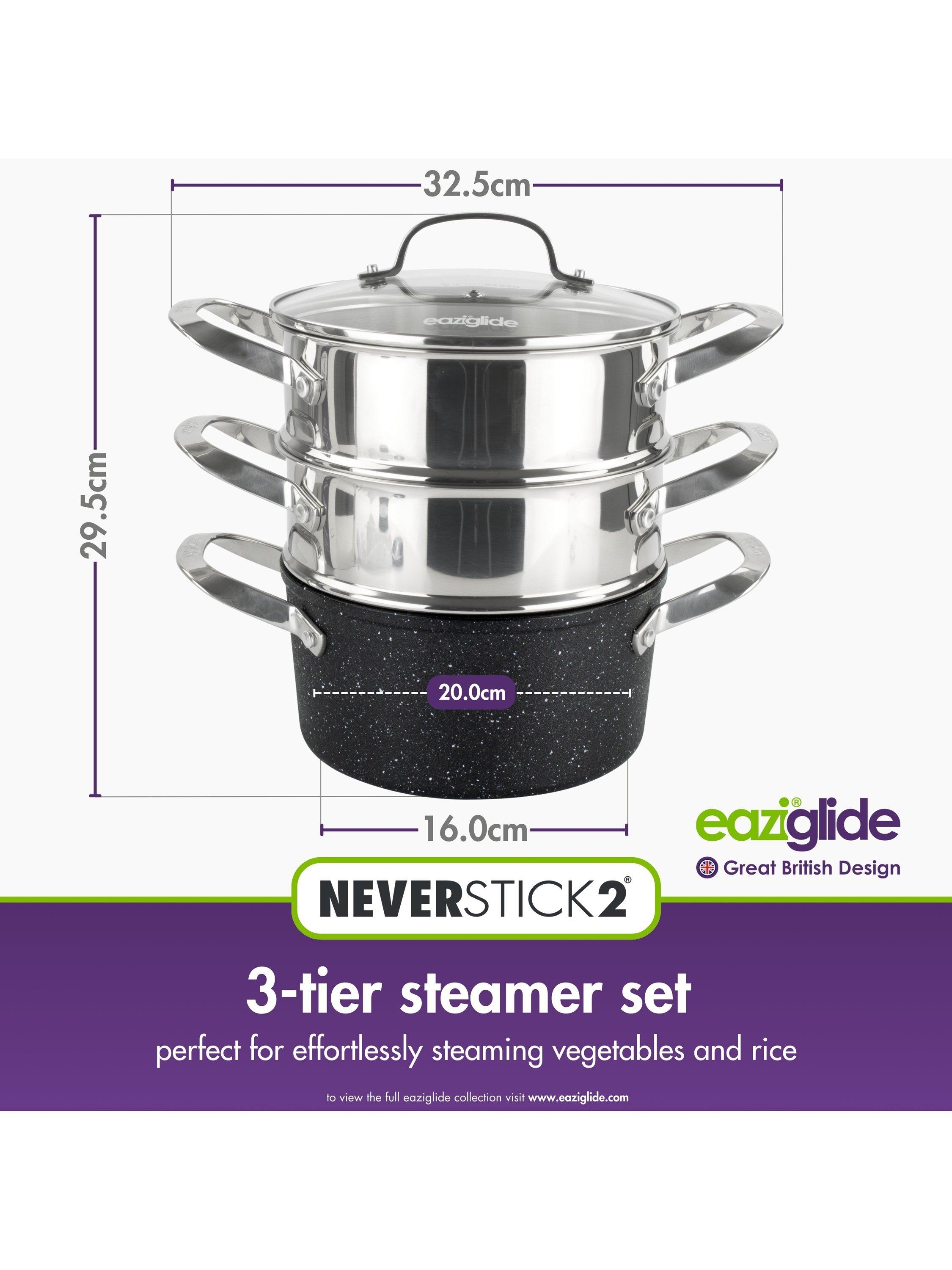 This versatile 3-tier steamer set includes a non-stick pot with two steamer inserts and a glass lid. The pot has a base constructed from highly durable, toughened aluminium and its Neverstick2 non-stick surface makes cooking easier and healthier. Dry fry on the hob without oil or butter or oven bake without greasing and benefit from the pot's excellent food release.