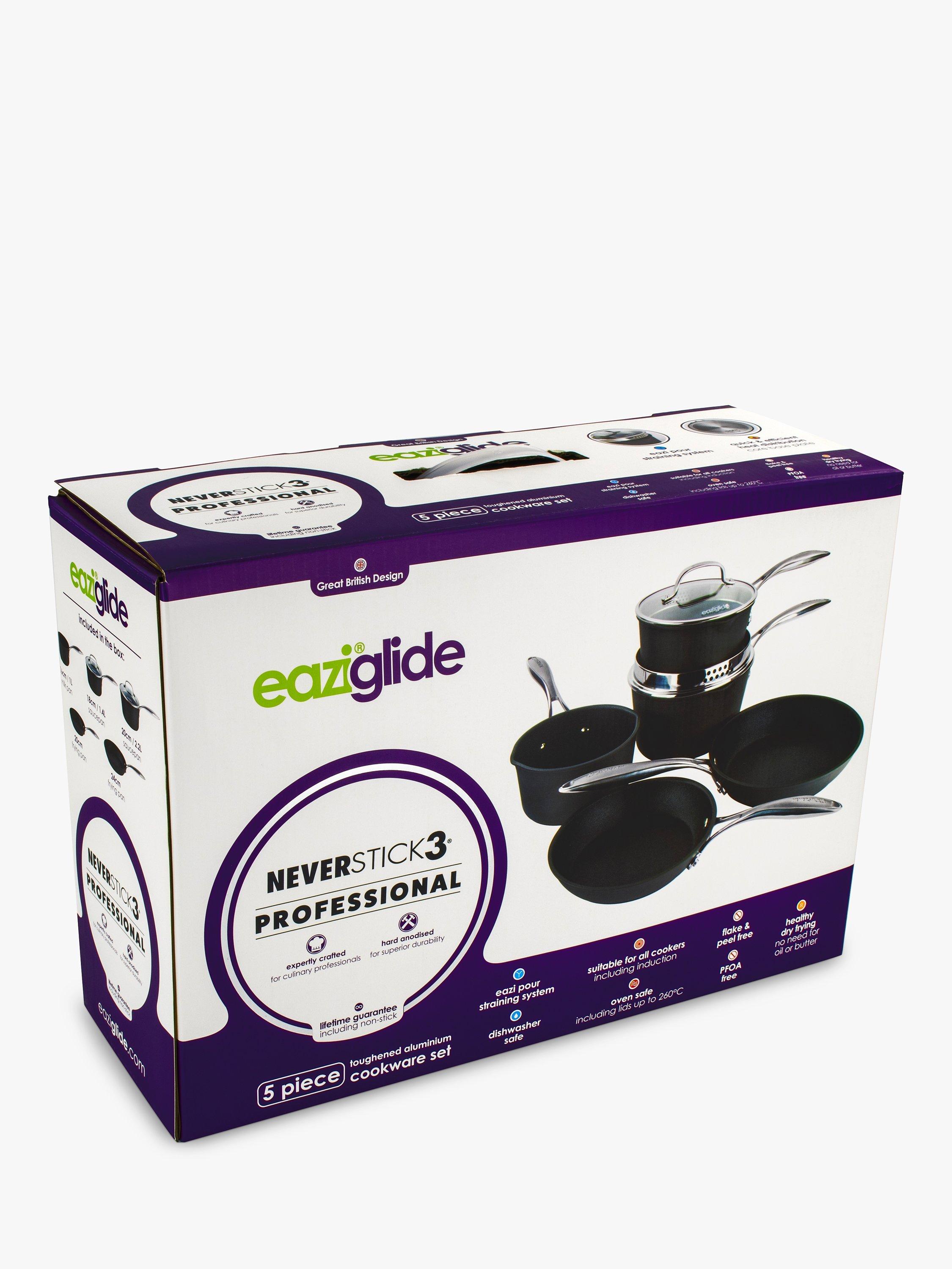 This expertly crafted pan set is ideal for all cookers including induction, can be used in the oven up to 260°C, cleaned in the dishwasher (although hand washing is easy and preferable) and features the Eaziglide lifetime guarantee. The set contains a 16cm milk pan, 20cm and 24cm frying pans and 18cm and 20cm saucepans with glass strainer lids.