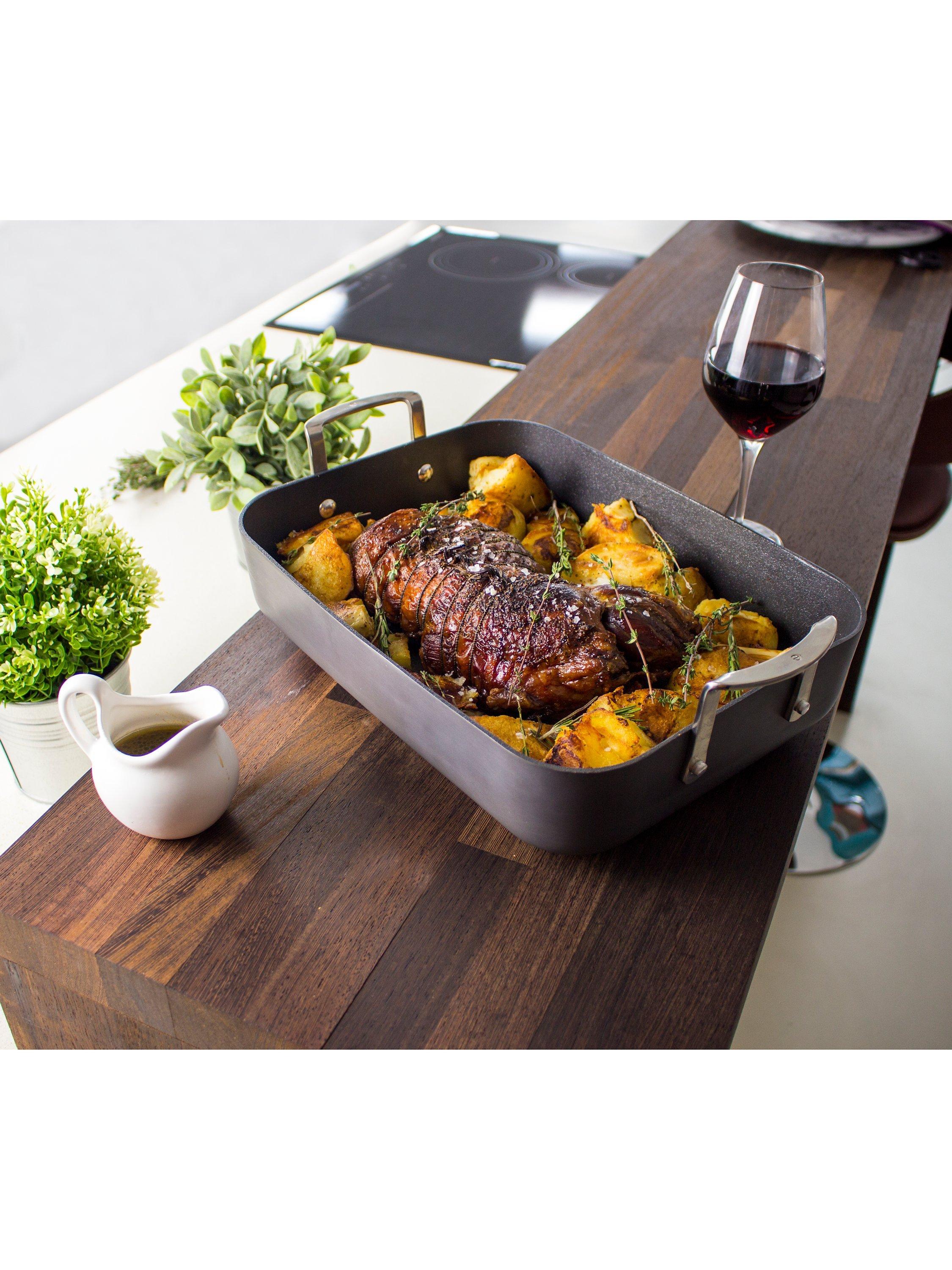 This expertly crafted and versatile roaster is designed for roasting in the oven and healthy dry frying on the hob, without the need for oil or butter. The hob top base allows for excellent heat distribution and induction suitability. It features large stainless steel handles for easy carrying.
