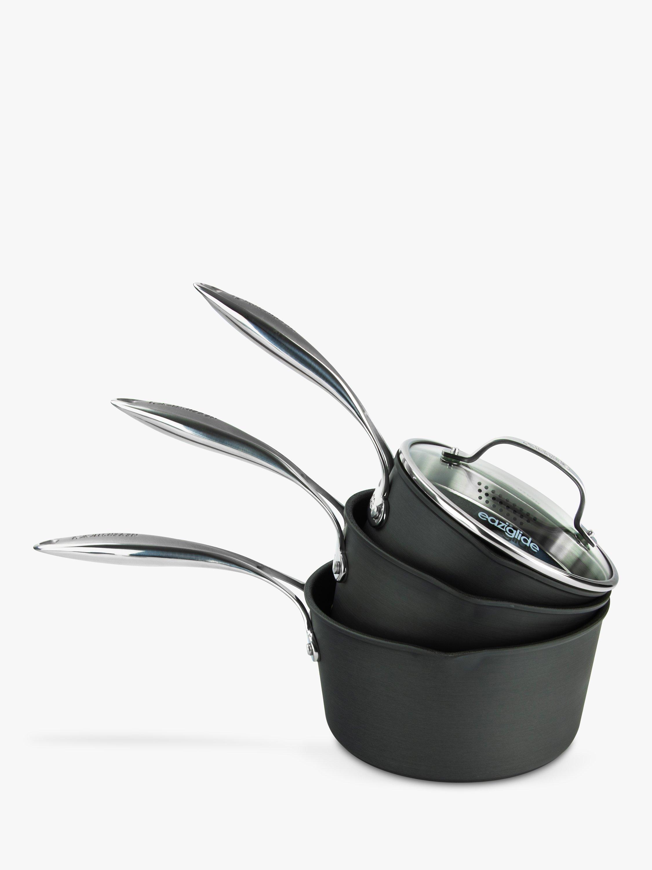 Each one features a clever ‘eazipour’ straining lid that allows you to drain excess water without the need for a colander and allows you to cook using no oil or fat for healthier meals.