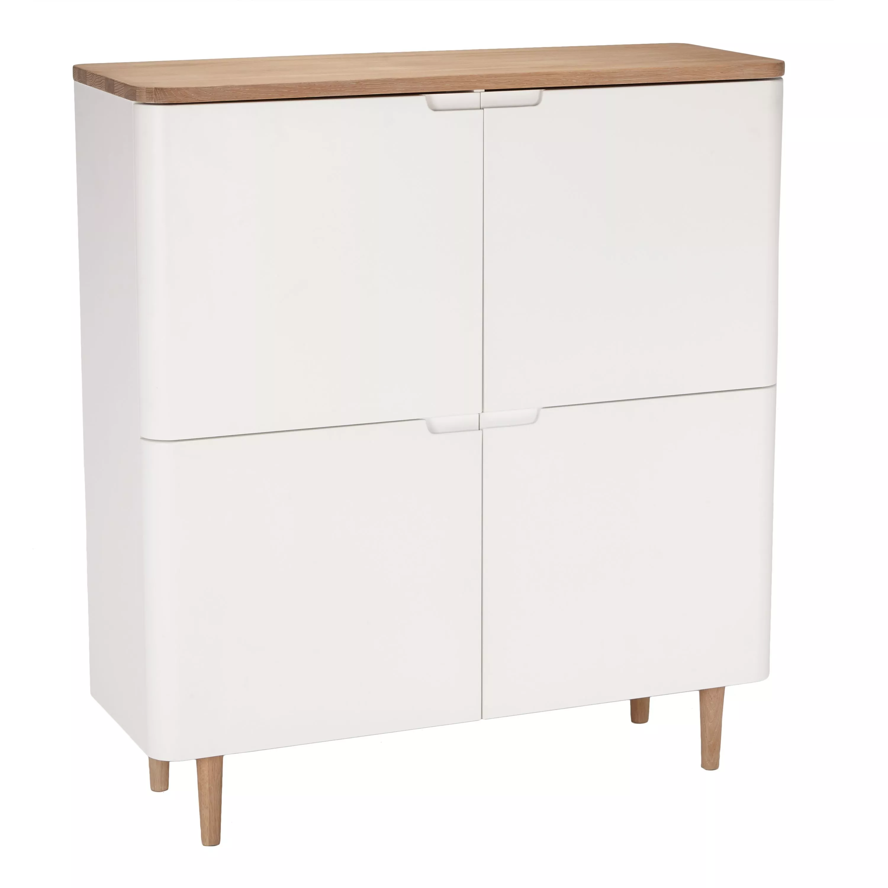 A practical storage cabinet that showcases a Scandi-inspired take on Mid-century design. It's made from high-quality solid oak and oak veneers and the doors are painted to create a modern look and bold contrast. Plus, there's internal shelving to help you keep everything organised. Finished with rounded edges and tapered legs for a softer styling accent.
