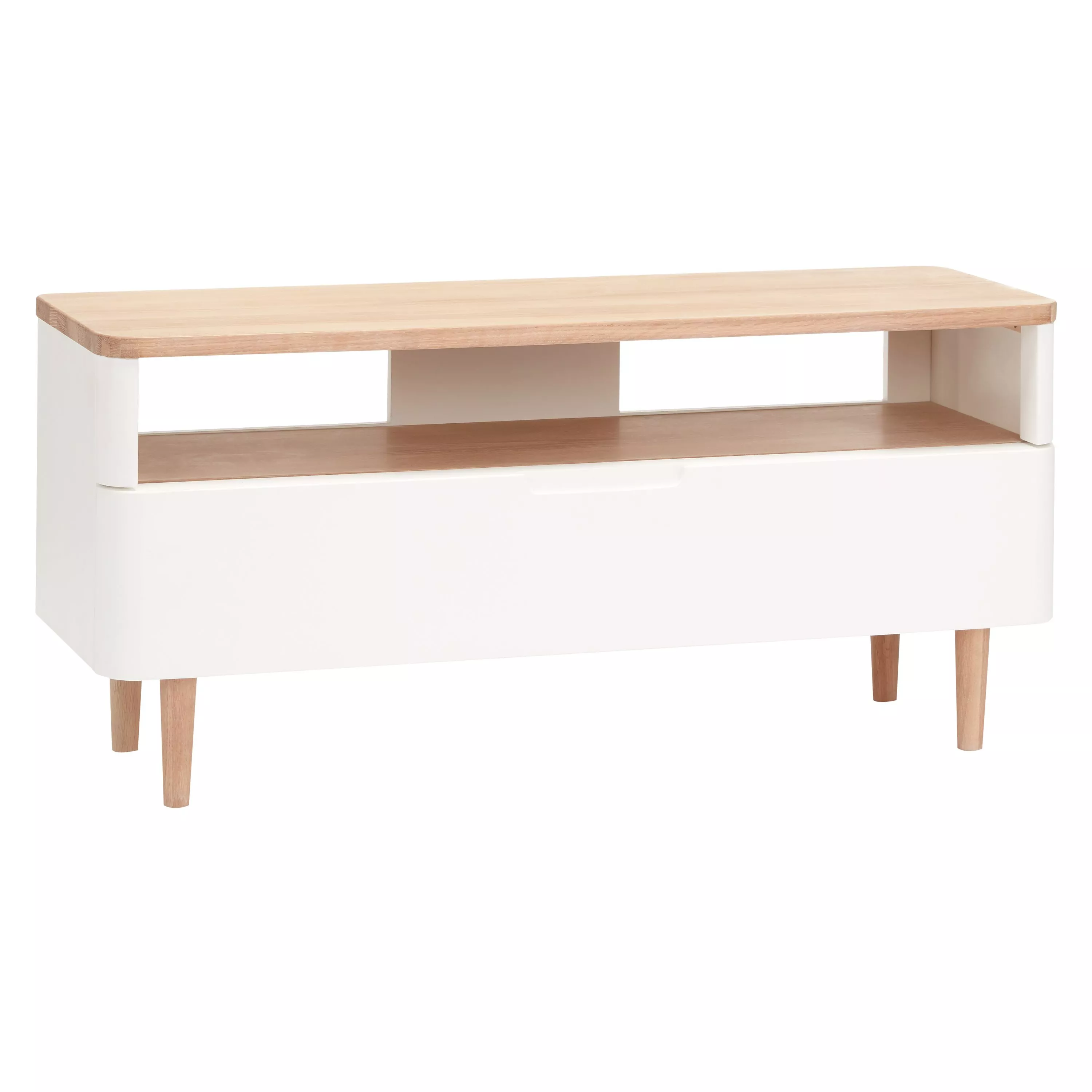 Designed for us by Ebbe Gehl, this TV stand offers a Scandi-inspired take on Mid-Century style. Available in two finishes, it's made from high-quality oak and oak veneer and its rounded edges and gently tapered legs bring a softer design focus to your space. There's plenty of storage space thanks to a deep drawer and shelf, and we like the contrast colour of the frame.