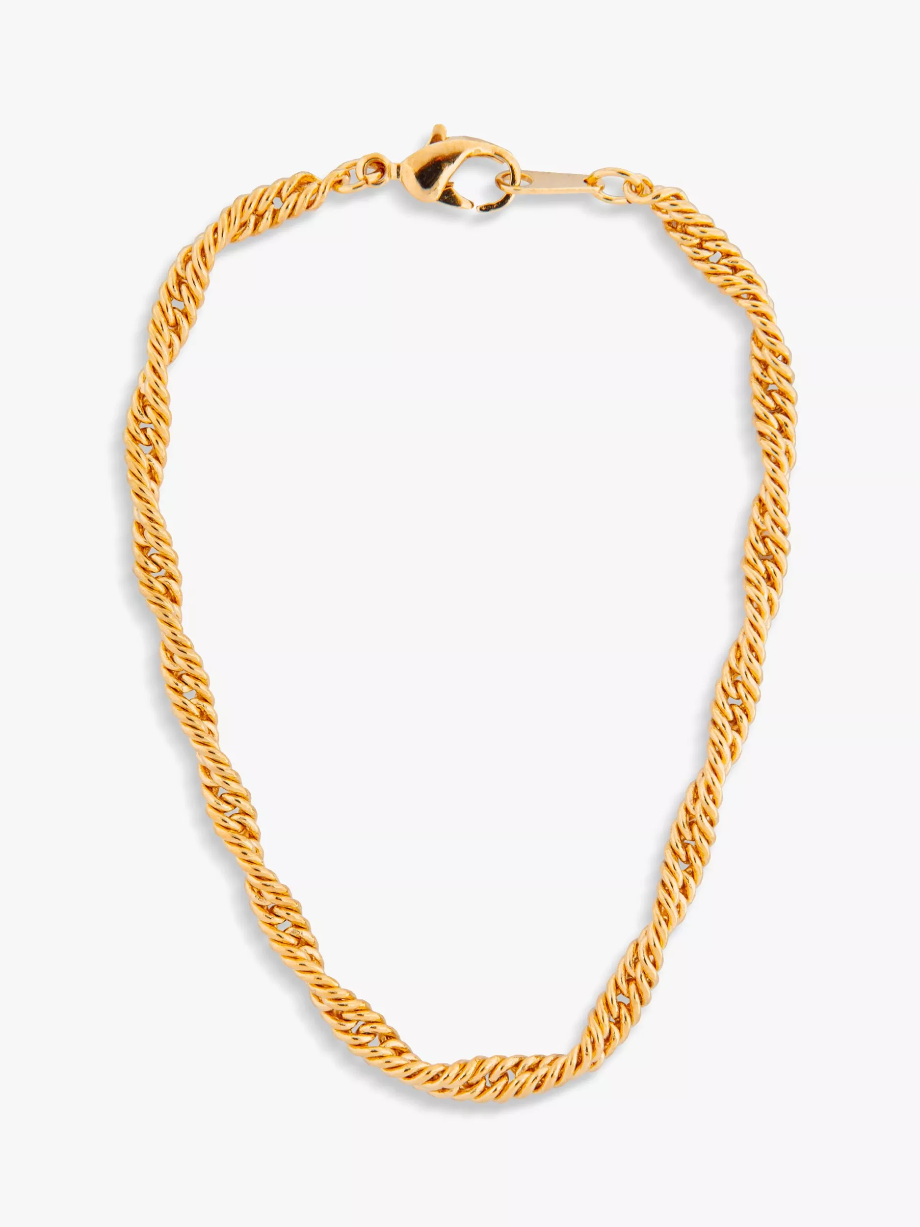 A twisted quality gold chain that sits at the base of the neck fastens with a lobster clasp.