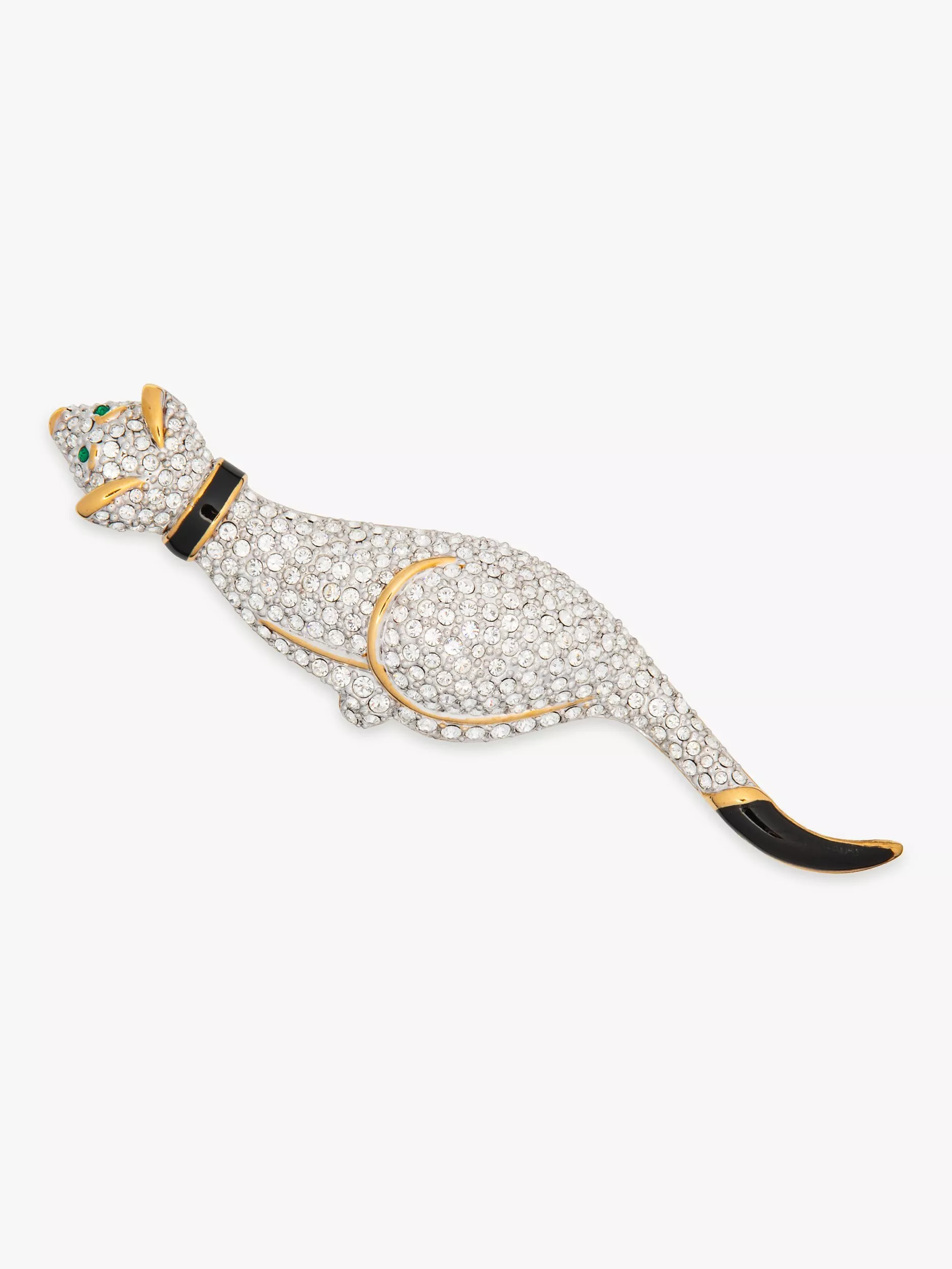 Rare Atwood and Sawyer 1980s brooch featuring a Swarovski crystal-encrusted cat offset with black enamel tail and collar and sparkling green eyes.