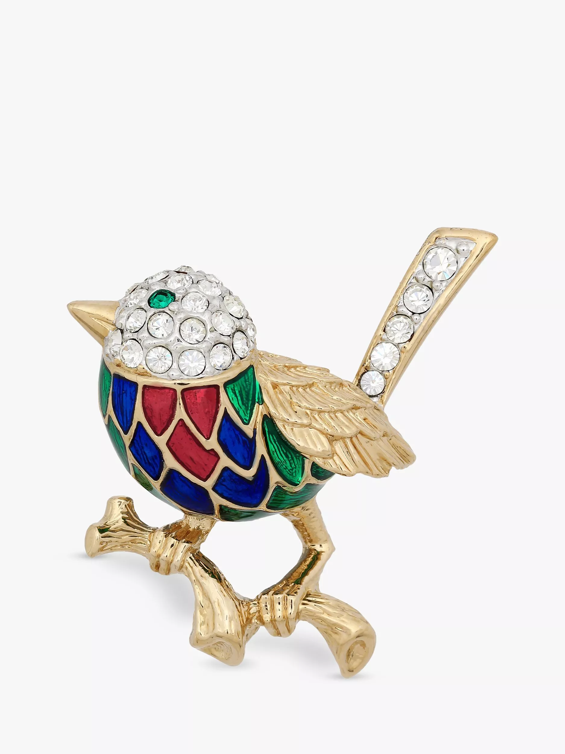 A charming 22ct gold-plated brooch in multicoloured enamel depicting a robin studded with Swarovski crystals. Made by Atwood and Sawyer in the 1980s.