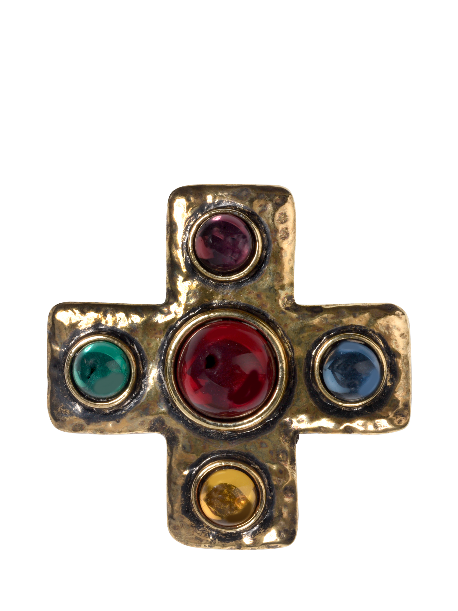A pre-loved, vintage cross brooch in 18ct antique gold plate from the 1980s. It's set with five jewel-coloured Cabochon glass stones and will elevate any winter coat or knitwear.