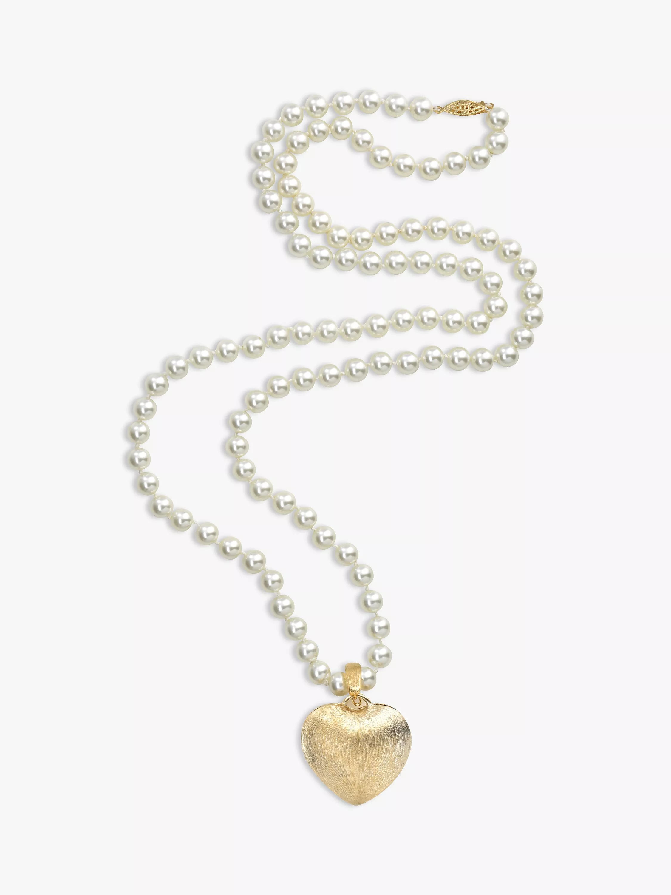 This unique style boasts a large detachable heart pendant made from satin-finished 18ct gold plated metal. It hangs on knotted cream pearls which can be worn alone in a long single or short double strand.