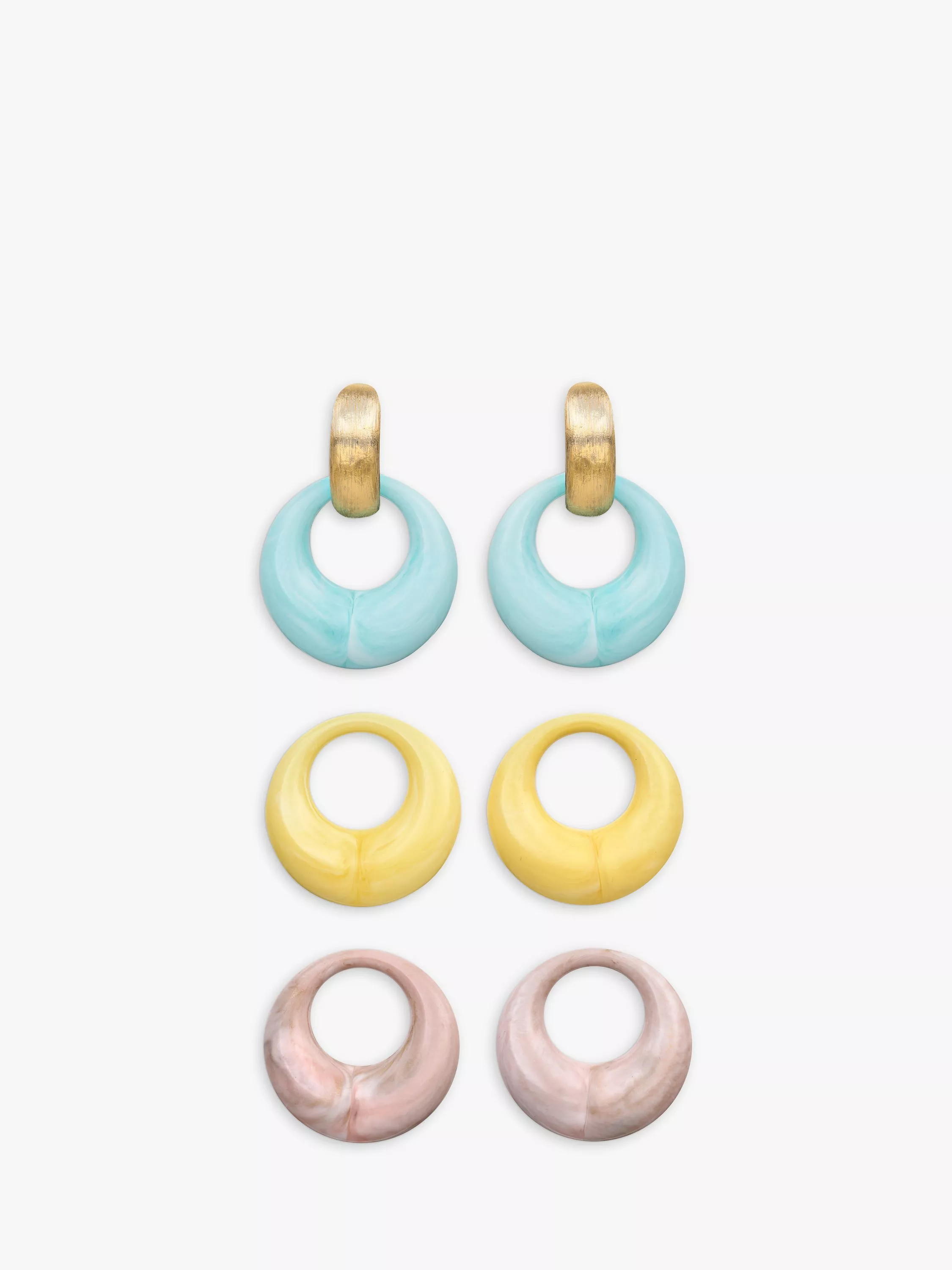A unique opportunity to purchase these iconic interchangeable vintage resin earrings dating from the 1970s to 80s. The earrings feature a gold plated demi hoop clip-on earring that can be worn alone or just add a coloured hoop of your choice for a new look! Comes with one pair of gold-plated hoop earrings and three pairs of resin hoops.