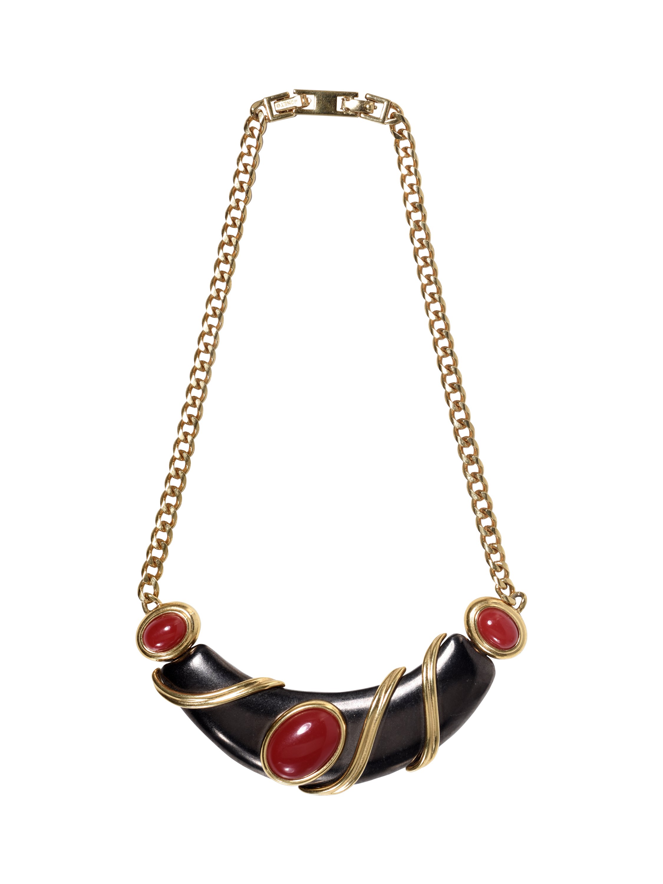 Wonderful Preloved original Vintage Monet Bib Statement necklace from the 1980s. It is made from 22ct gold plate with a dark grey oxidised central panel featuring three large burnt red oval resin cabochons. The flat curb link chain has the original 3cm extension piece in place and is signed Monet on the back of the clasp.