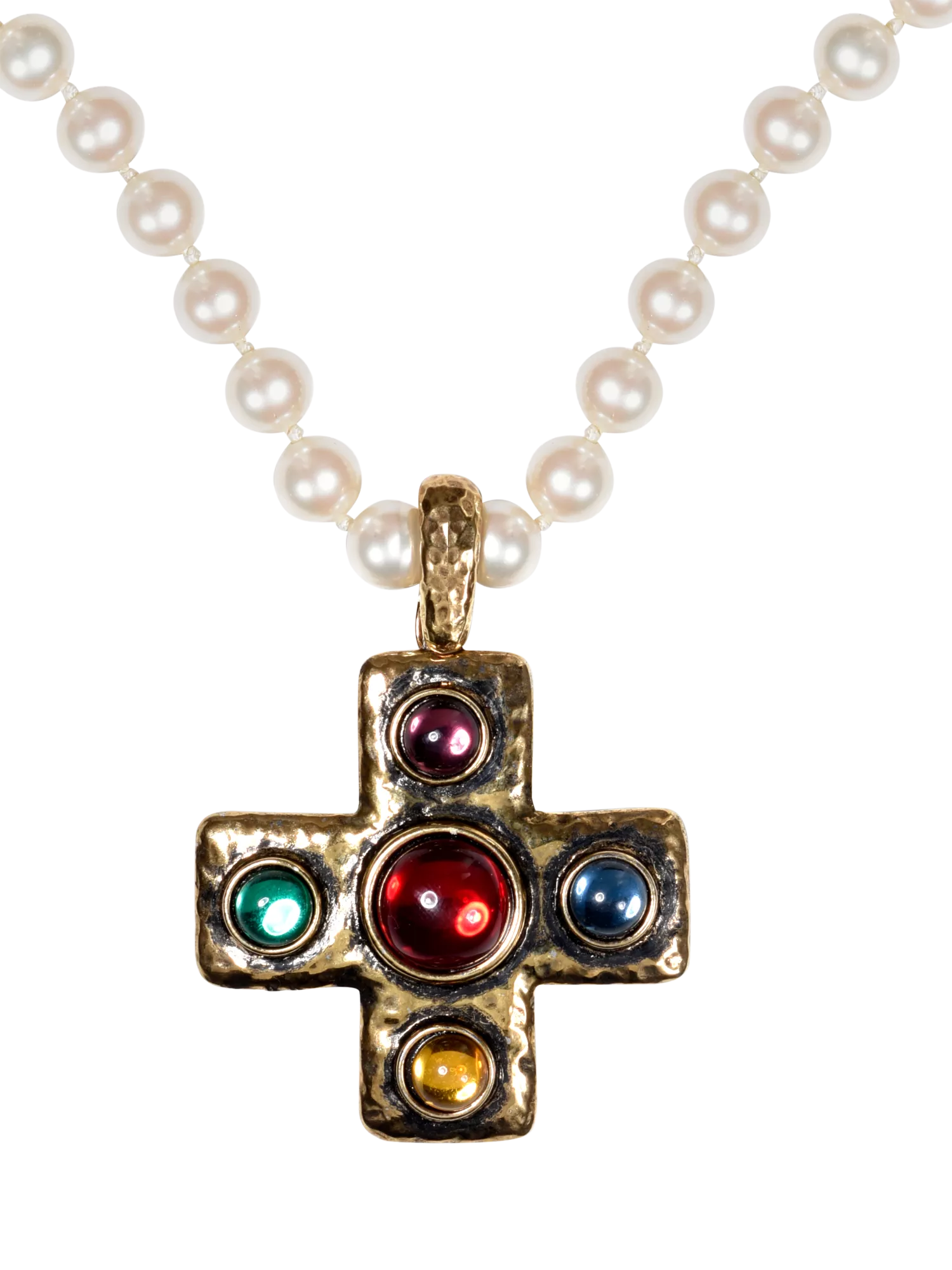 An antique gold-plated pendant in a square cross formation with multicoloured cabochon glass stones is suspended from a long length of cream faux knotted pearls with a gold-plated clasp. The pendant measures 4.5cm and has an adjustable bail so the pearls can be worn alone if desired.