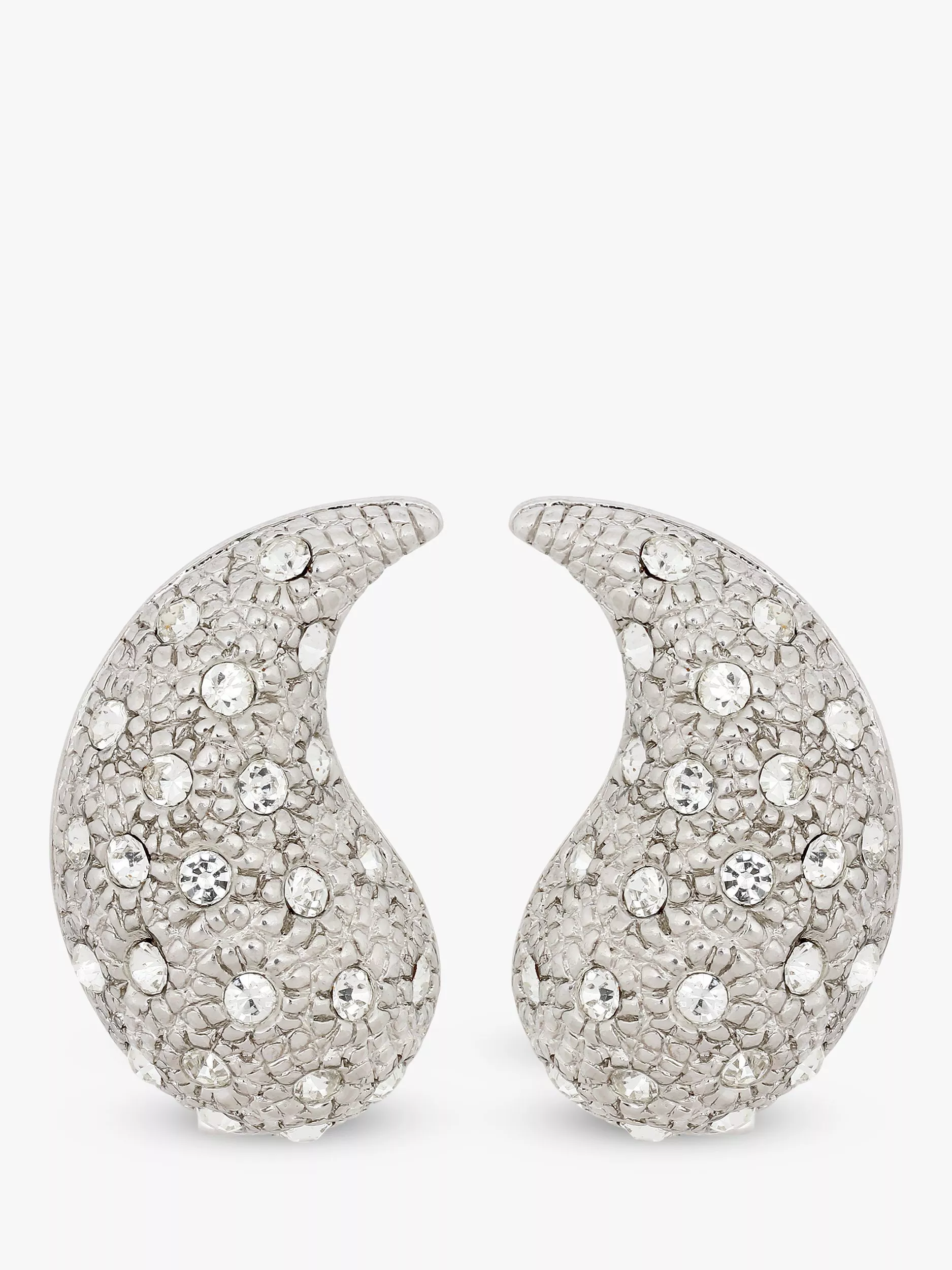 These small comma-shaped earrings offer a glamourous and elegant style. Made circa the 1980s, they have a textured finish complemented with sparkling cubic Swarovski crystals. They are secured with clip-on fastenings that make them suitable for anyone to wear.