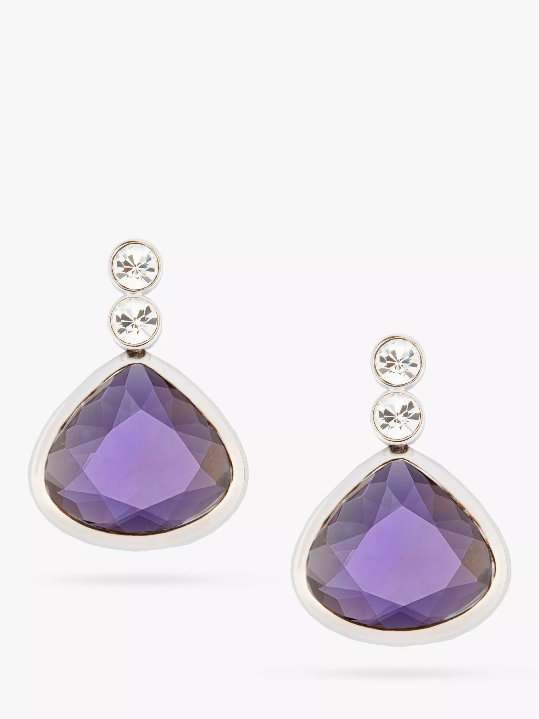 These pierced earrings from the 1990s are comprised of a large clear faceted stone in a rub-over Rhodium-plated setting topped with two bright Swarovski crystals.