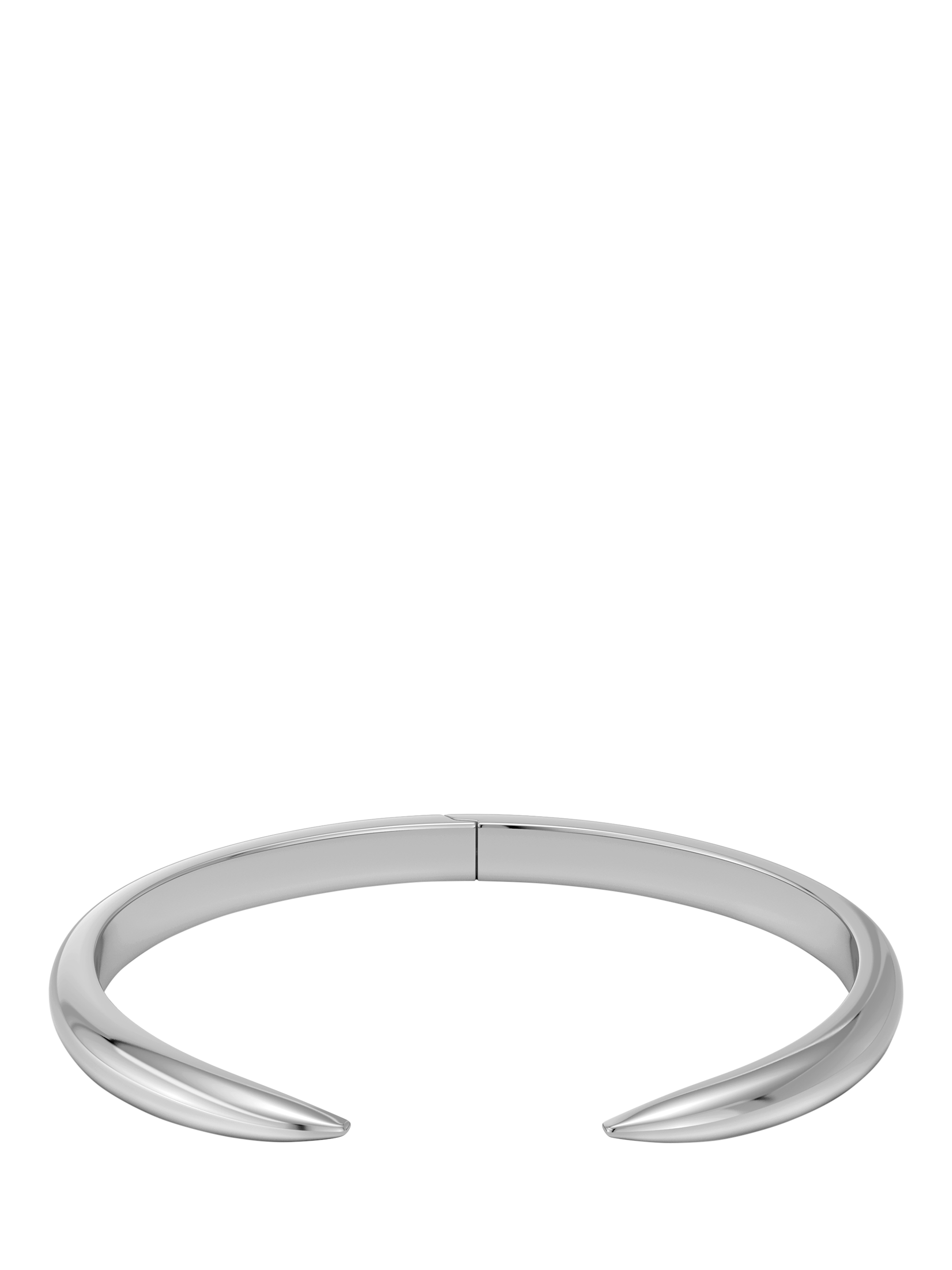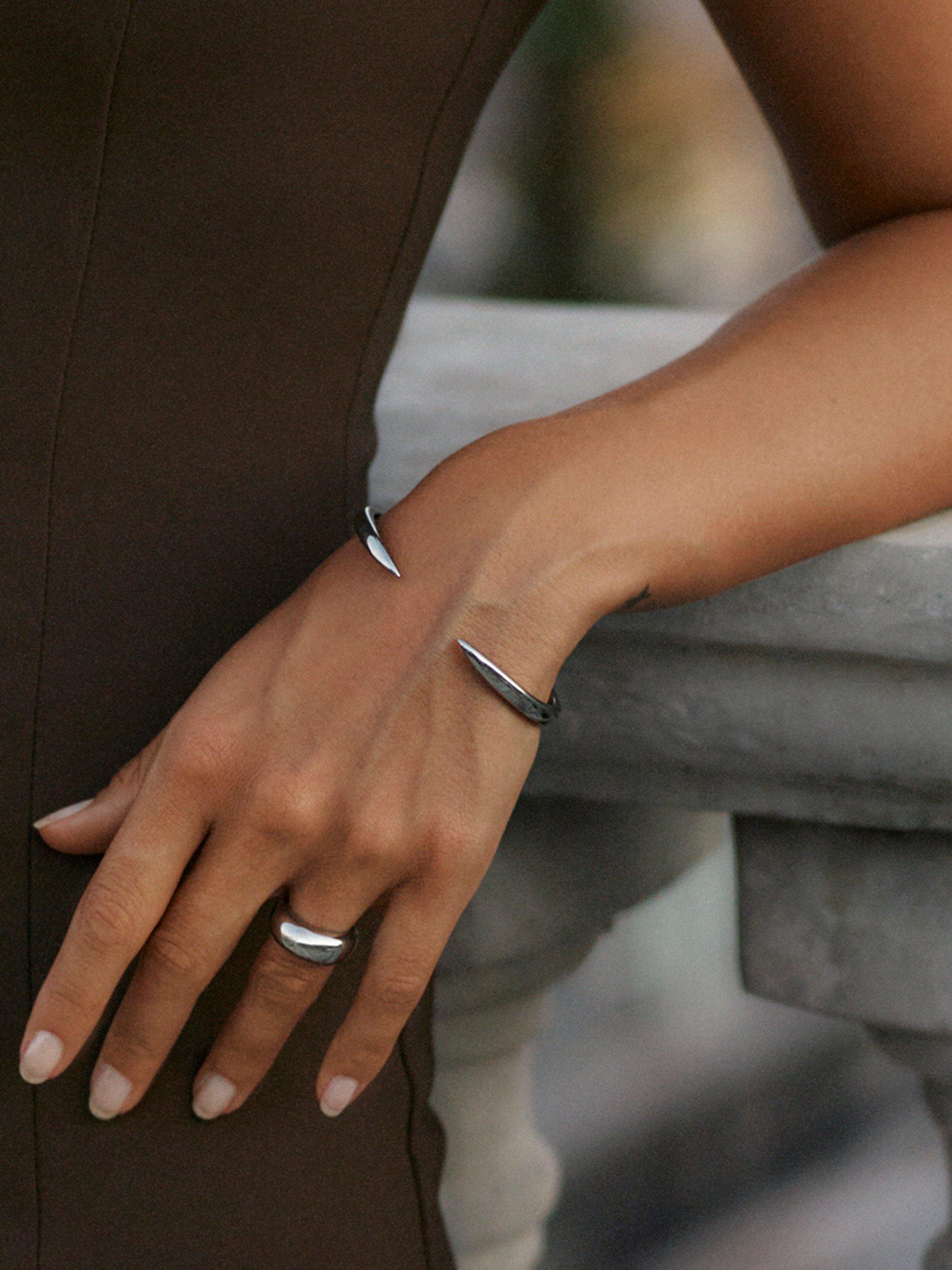 The Crest bangle is a narrow, slightly rounded rigid bracelet with a pointed end, perfect for wearing alone or layered with other bracelets. Featuring a spring opening, it is easy to put on and take off.