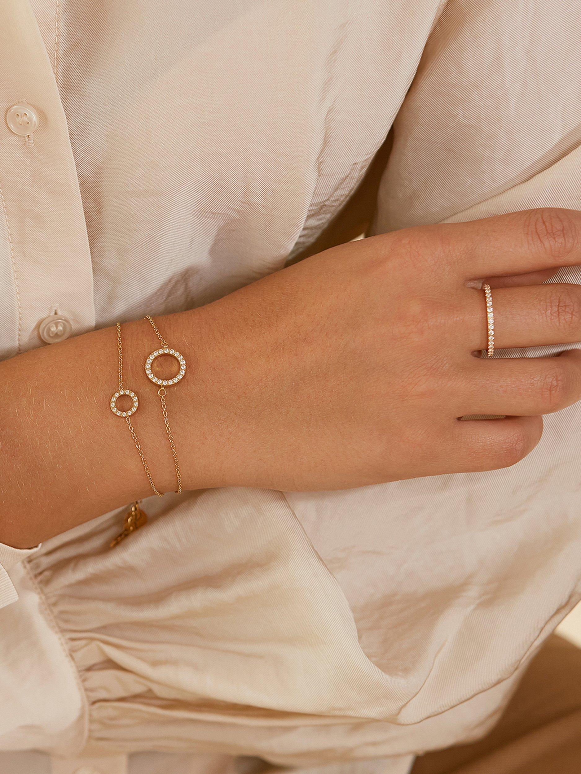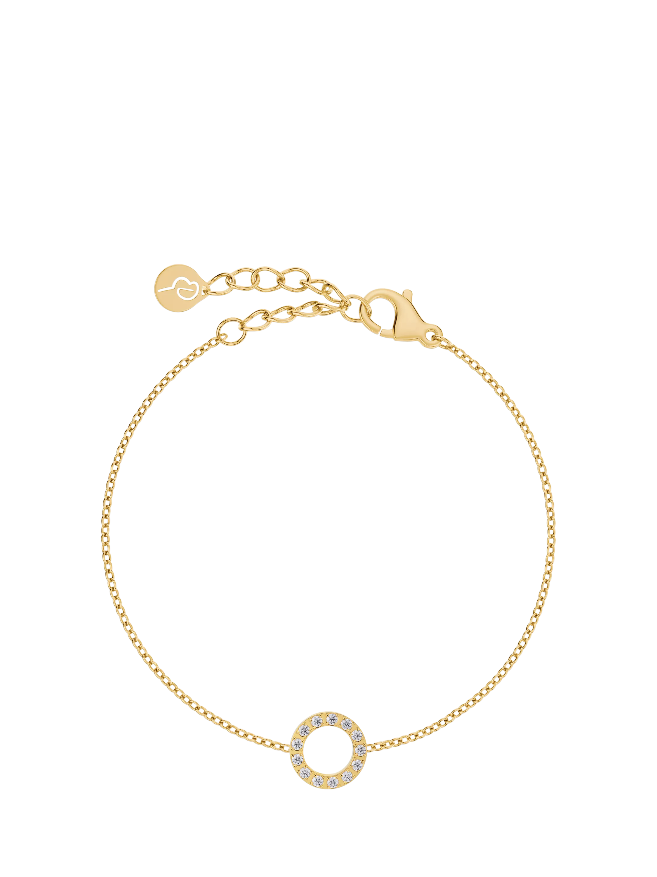 The Glow bracelet mini features a small ring with 13 stones which is secured by an anchor chain. Available in a choice of stainless steel or gold plated steel finishes, it has a adjustable extender chain for the perfect fit.