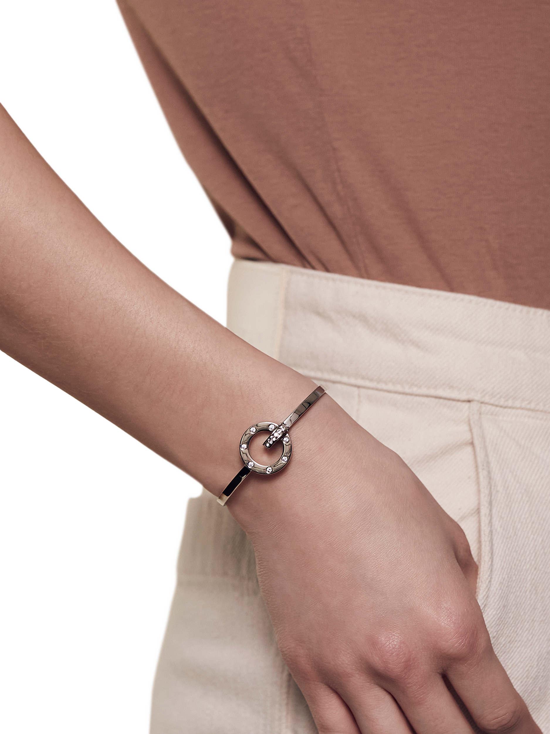 Ida is an elegant and rigid bangle that has connected rings set with clear stones. This modern design makes for the perfect gift.