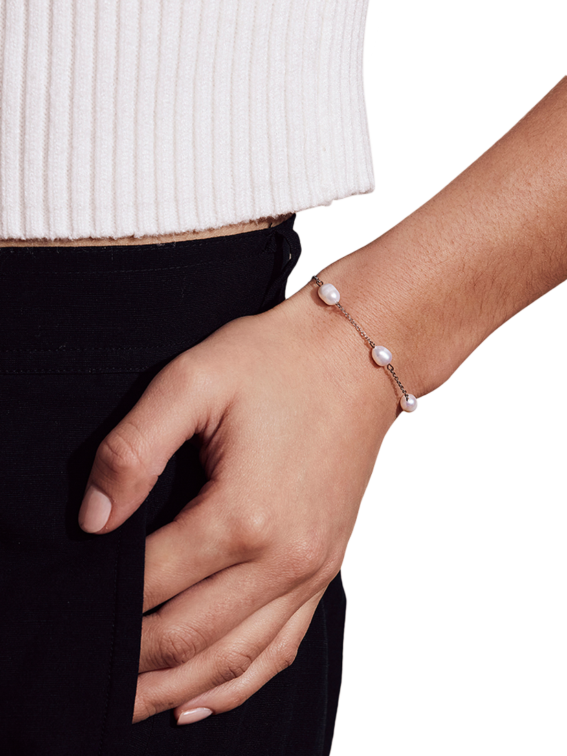 The Perla bracelet features a series of 5 beautiful freshwater pearls linked by a delicate chain. Their natural shape offers excitement and elegance, as well as a unique look.