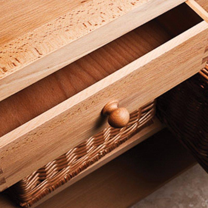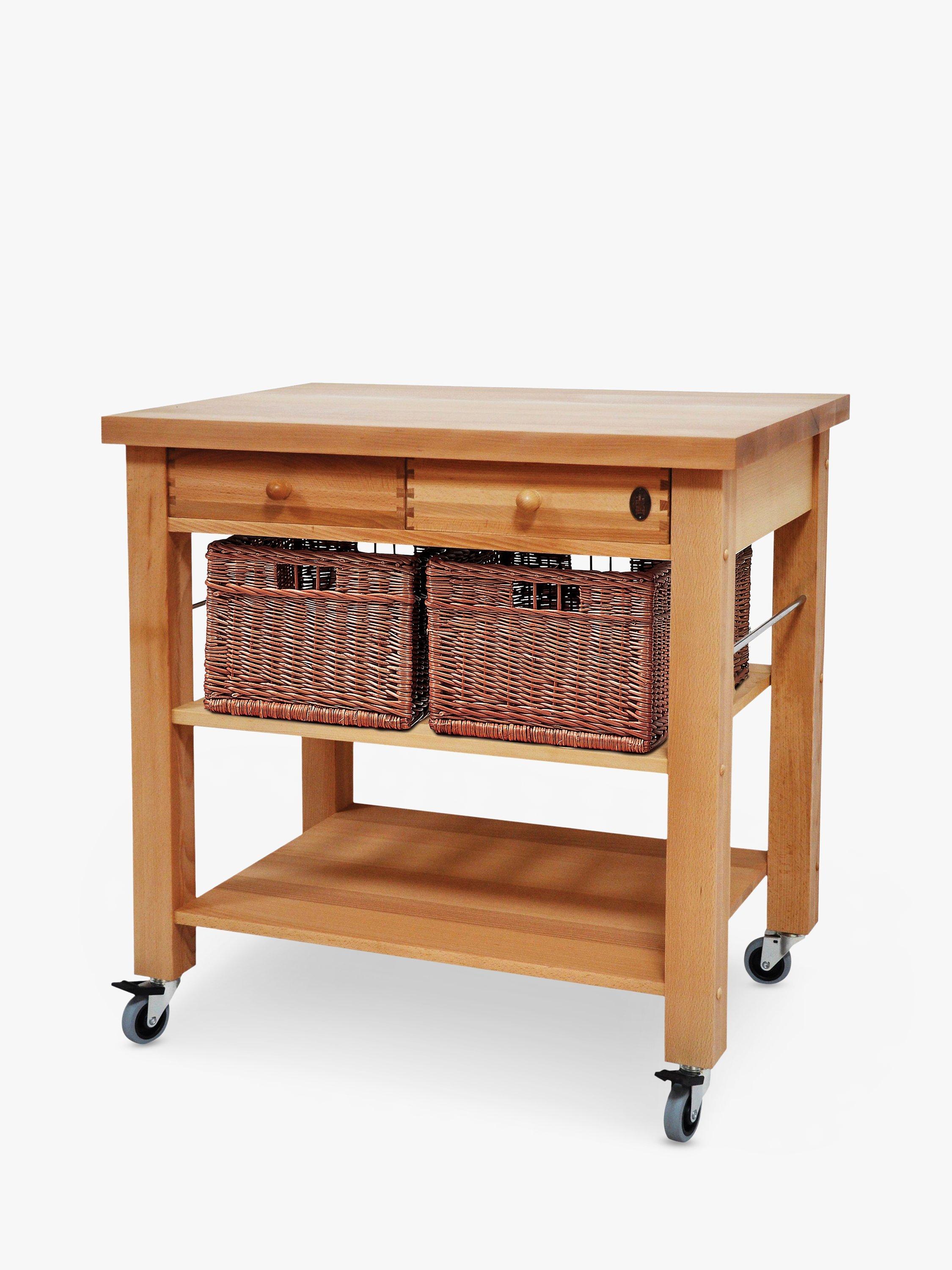 A versatile solution for every kitchen, this Lambourn butcher's trolley from Eddingtons has a beechwood work surface and two dovetailed drawers with handmade wicker baskets.