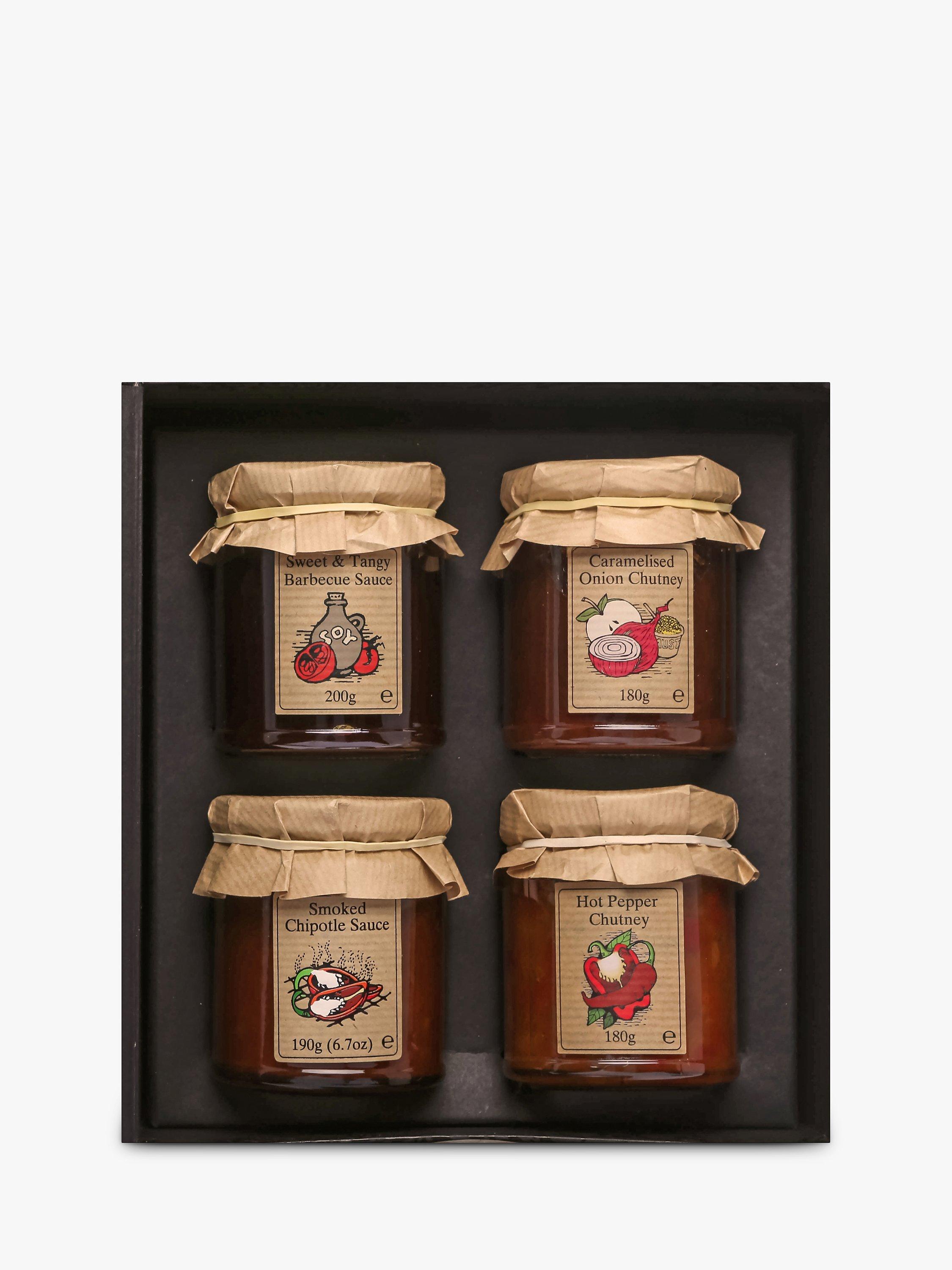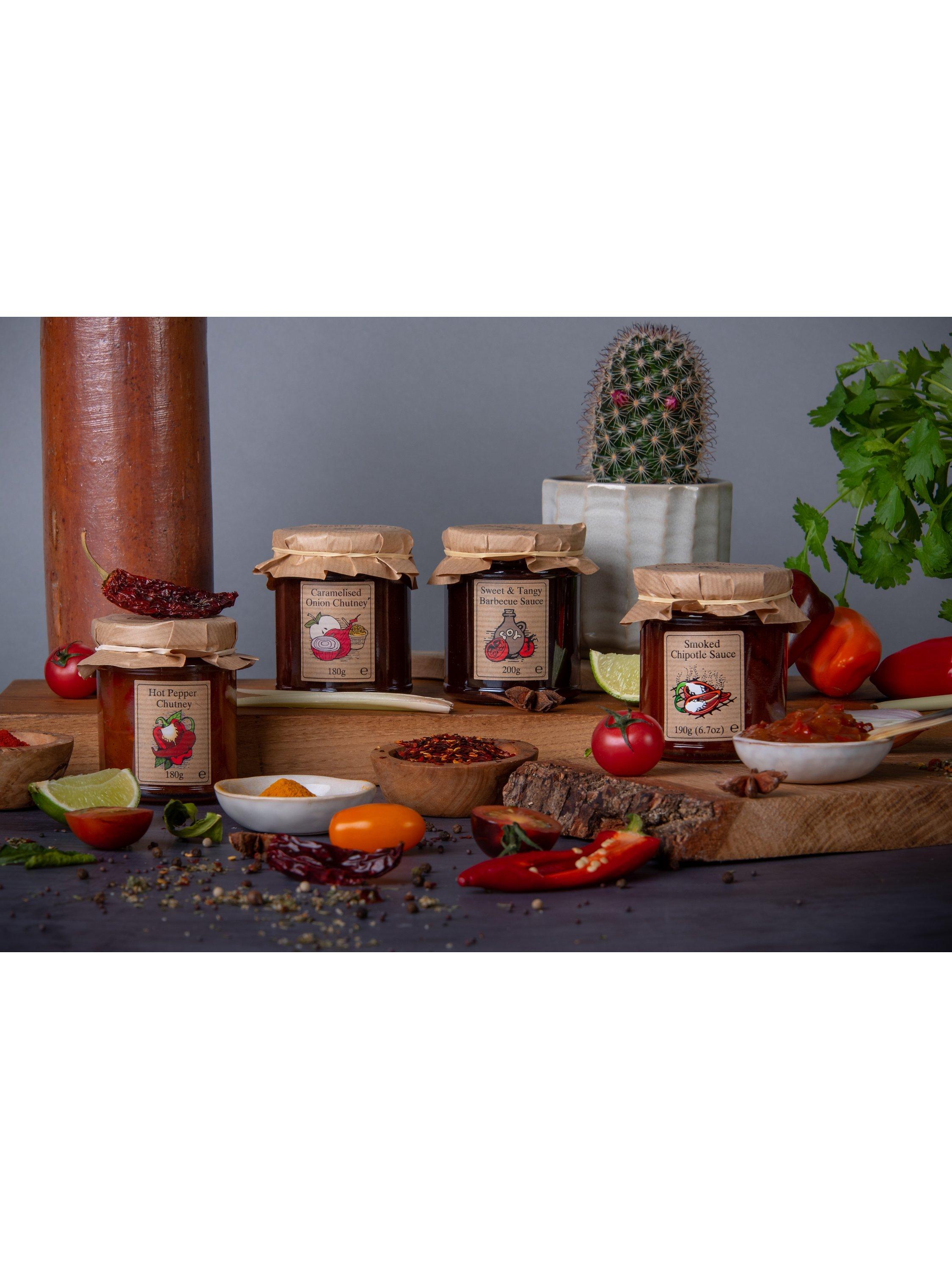 Four amazing preserves to complement your barbecue creations. The sweet and tangy barbecue sauce is perfect with sausages; try the smoked chipotle sauce with fish, or add some heat to meat with the hot pepper chutney.
