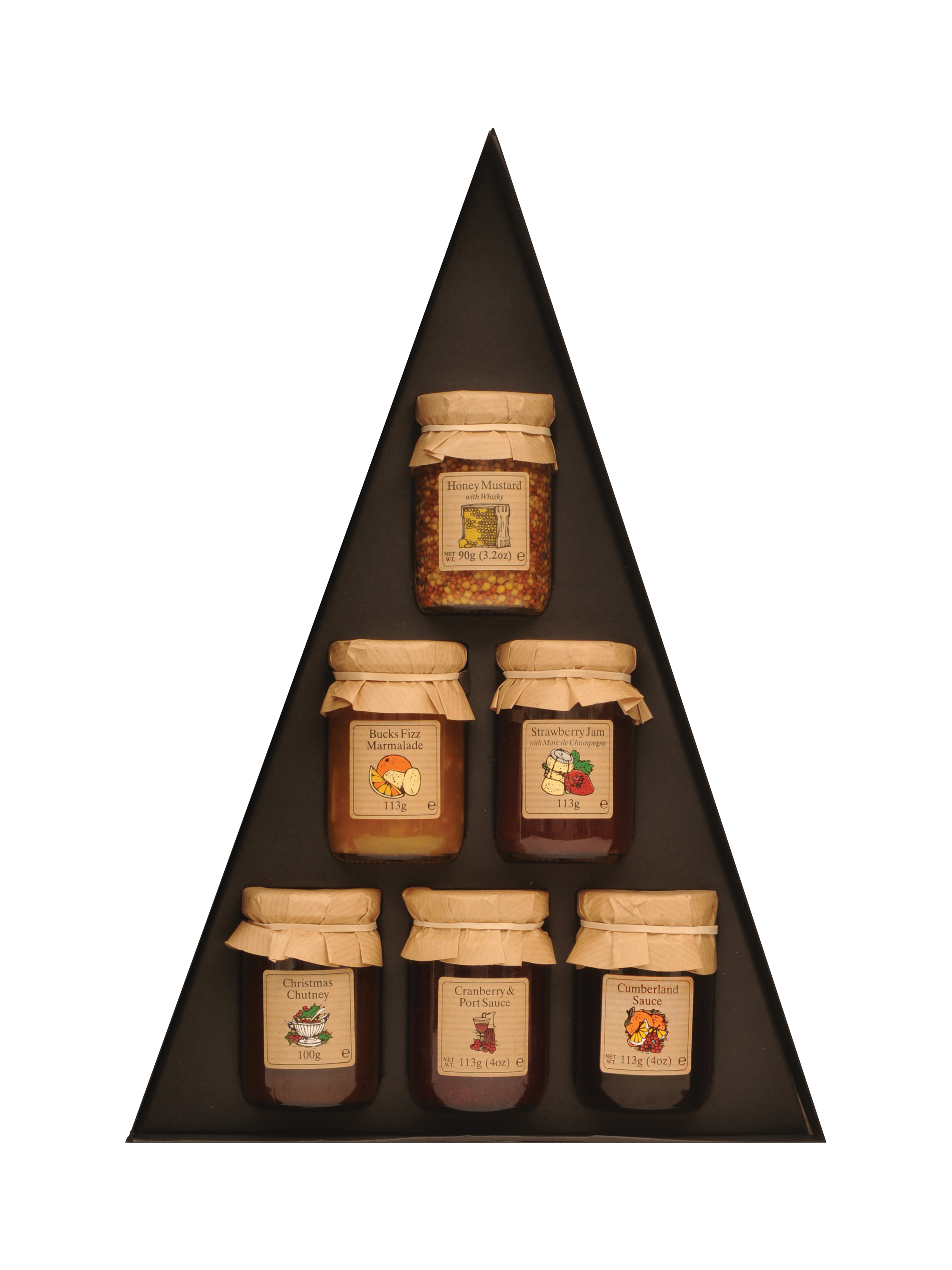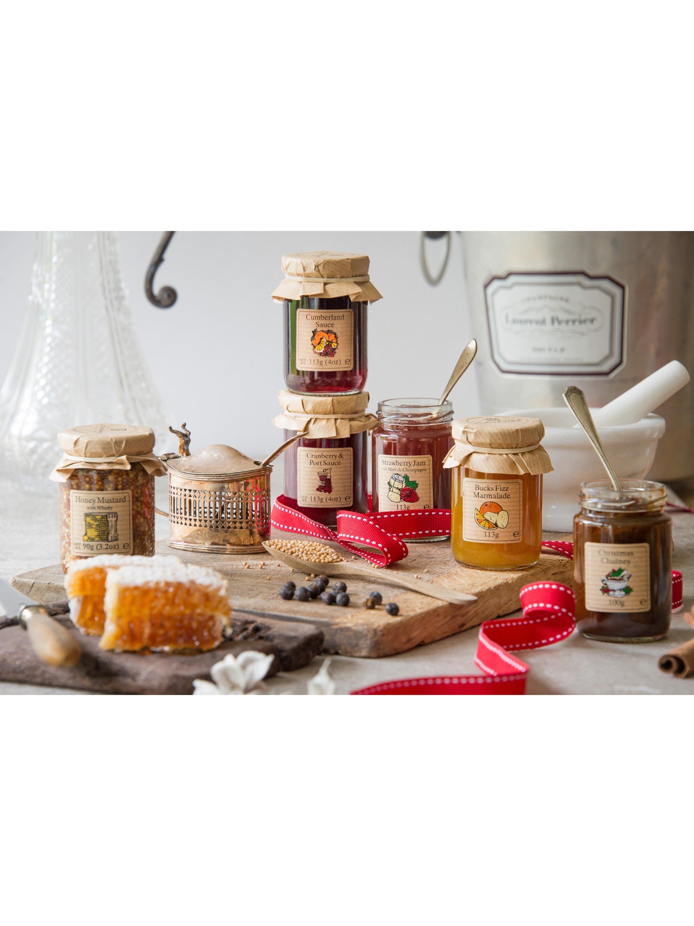 - Bucks Fizz Marmalade 113g Ingredients: Sugar, Oranges (35%), Lemon Juice (from concentrate), Champagne (0.7%), Marc de Champagne (0.3%), Gelling Agent: Fruit Pectin, Acidity Regulator: Citric Acid. Prepared with 35g of fruit per 100g. Total sugar content 65g per 100g. Made in the UK. Strawberry Jam with Champagne 113g Ingredients: Sugar, Strawberries (45%), Champagne (0.7%), Gelling Agent: Fruit Pectin, Acidity Regulator: Citric Acid, Marc de Champagne (0.3%). Prepared with 45g of fruit per 100g. Total sugar content 65g per 100g. Made in the UK. Christmas Chutney 100g Ingredients: Brown Sugar, Apricots (20%), Onions (20%), Malt Vinegar (from BARLEY), Apples (14%), Dates (8%), Salt, Ground Ginger, Ground Cloves, Ground Cinnamon, Ground Nutmeg, All spice. May contain traces of MUSTARD and date stone fragments. Made in the UK. Cranberry and Port Sauce 113g Ingredients: Cranberries (43%), Sugar, Water, Port (3%). Made in the UK Cumberland Sauce 113g Ingredients: Sugar, Oranges (25%), Redcurrant Juice Concentrate (4%), Port (3.5%), Gelling Agent: Fruit Pectin, Spices. Made in the UK Honey MUSTARD with Whisky 90g Ingredients: Water, MUSTARD seeds (30%), White Wine Vinegar, Sugar, Salt, Honey (1%), Whisky (1%), Black Pepper. Made in the UK For allergens, see ingredients in capitals.