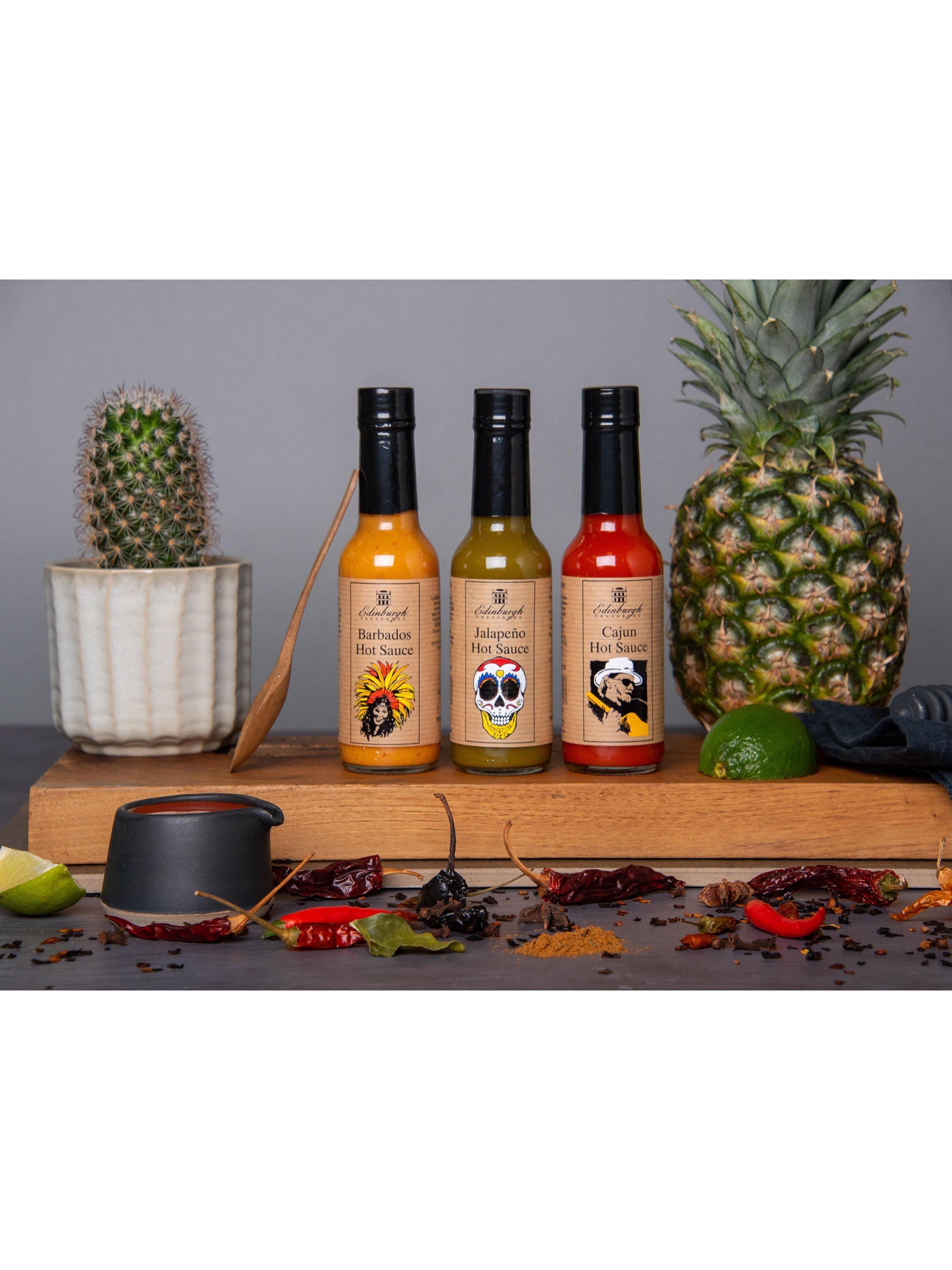 A trio of sauces from around the world, each brimming with spices, flavour and varying degrees of heat! The Caribbean Hot sauce (148ml) is a classic from Barbados and is perfect with meat, poultry or fish. Named after the town of Jalapa in Mexico; the Jalapeno Sauce (148ml) has a distinctly fresh grassy flavour making it a favourite among chilli lovers. The Cajun is a typical aged red pepper Louisiana style Hot Sauce (148ml).