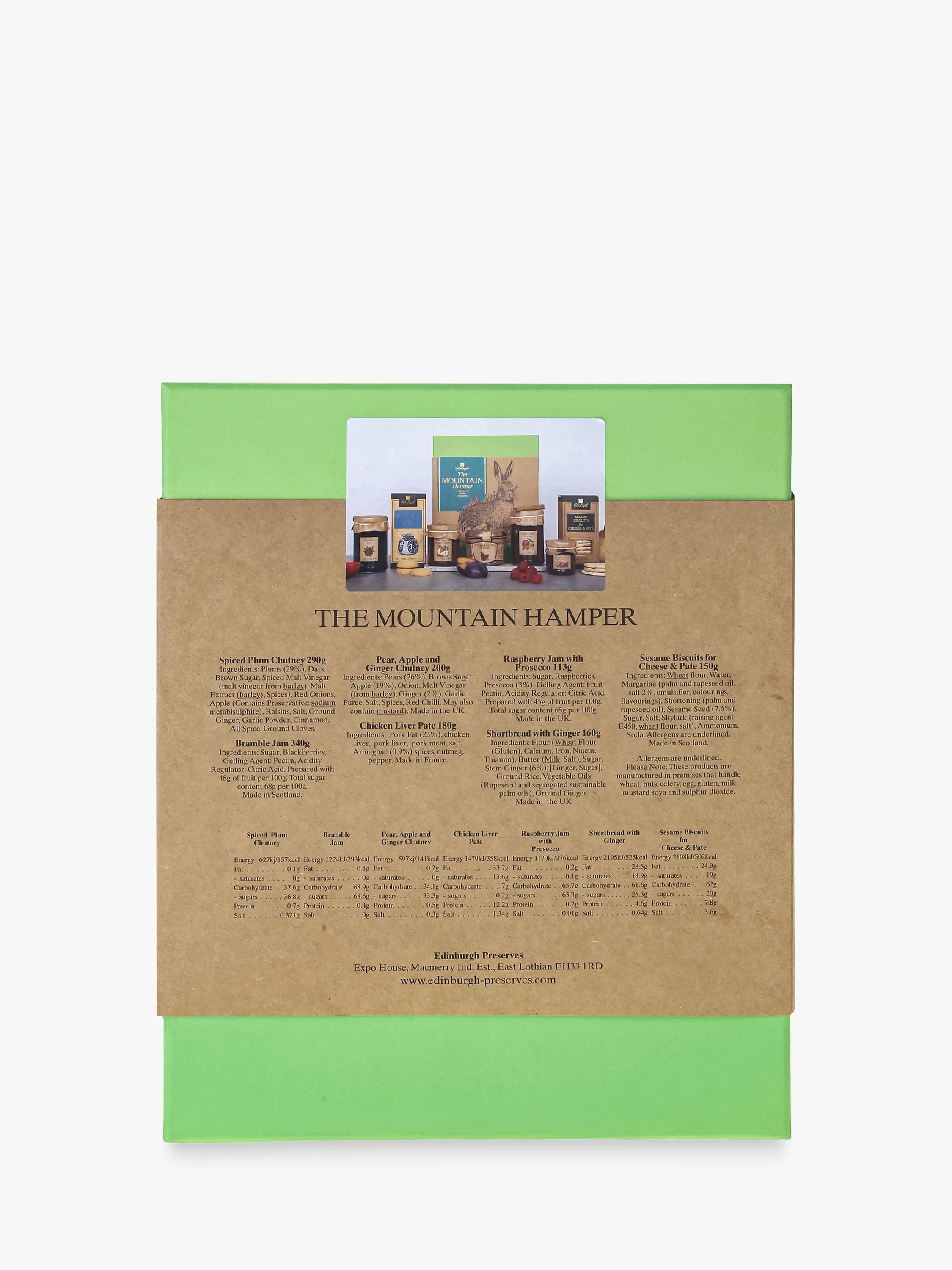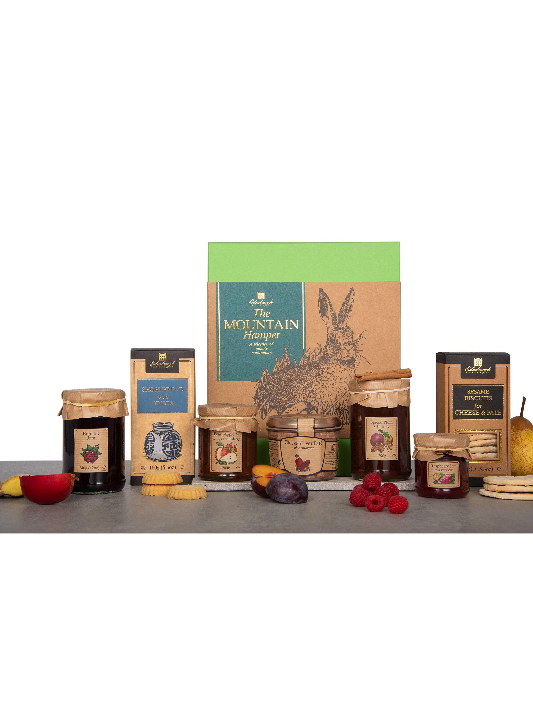- Spiced Plum Chutney 290gIngredients: Plums (29%), Dark Brown Sugar, Spiced Malt Vinegar (malt vinegar from BARLEY), Malt Extract (BARLEY), Spices), Red Onions, Apple (Contains Preservative: sodium metabiSULPHITE), Raisins, Salt, Ground Ginger, Garlic Powder, Cinnamon, All Spice, Ground Cloves. Bramble Jam 340g Ingredients: Sugar, Blackberries, Gelling Agent: Pectin, Acidity Regulator: Citric Acid. Prepared with 48g of fruit per 100g. Total sugar content 68g per 100g. Made in Scotland.Pear, Apple and Ginger Chutney 200g Ingredients: Pears (26%), Brown Sugar, Apple (19%), Onion, Malt Vinegar (from BARLEY), Ginger (2%), Garlic Puree, Salt, Spices, Red Chilli. May also contain MUSTARD). Made in the UKChicken Liver Pate 180gIngredients -, Pork Fat (23%), chicken liver, pork liver, pork meat, salt, Armagnac (0.9%) spices, nutmeg, pepper. Made in FranceRaspberry Jam with Prosecco 113g Ingredients: Sugar, Raspberries, Prosecco (3%), Gelling Agent: Fruit Pectin, Acidity Regulator: Citric Acid. Prepared with 45g of fruit per 100g. Total sugar content 65g per 100g. Made in the UKShortbread with Ginger 160gIngredients - Flour (WHEAT Flour (GLUTEN), Calcium, Iron, Niacin, Thiamin), Butter (MILK, Salt), Sugar, Stem Ginger (6%), [Ginger, Sugar], Ground Rice, Vegetable Oils (Rapeseed and segregated sustainable palm oils), Ground Ginger. Made in the UKSESAME Biscuits for Cheese & Pate 150gIngredients: WHEAT flour, Water, Margarine (palm and rapeseed oil, salt 2%, emulsifier, colourings, flavourings), Shortening (palm and rapeseed oil), SESAME Seed (7.6%), Sugar, Salt, Skylark (raising agent E450, WHEAT flour, salt), Ammonium, Soda. Made in Scotland. For allergens, see ingredients in capitals.