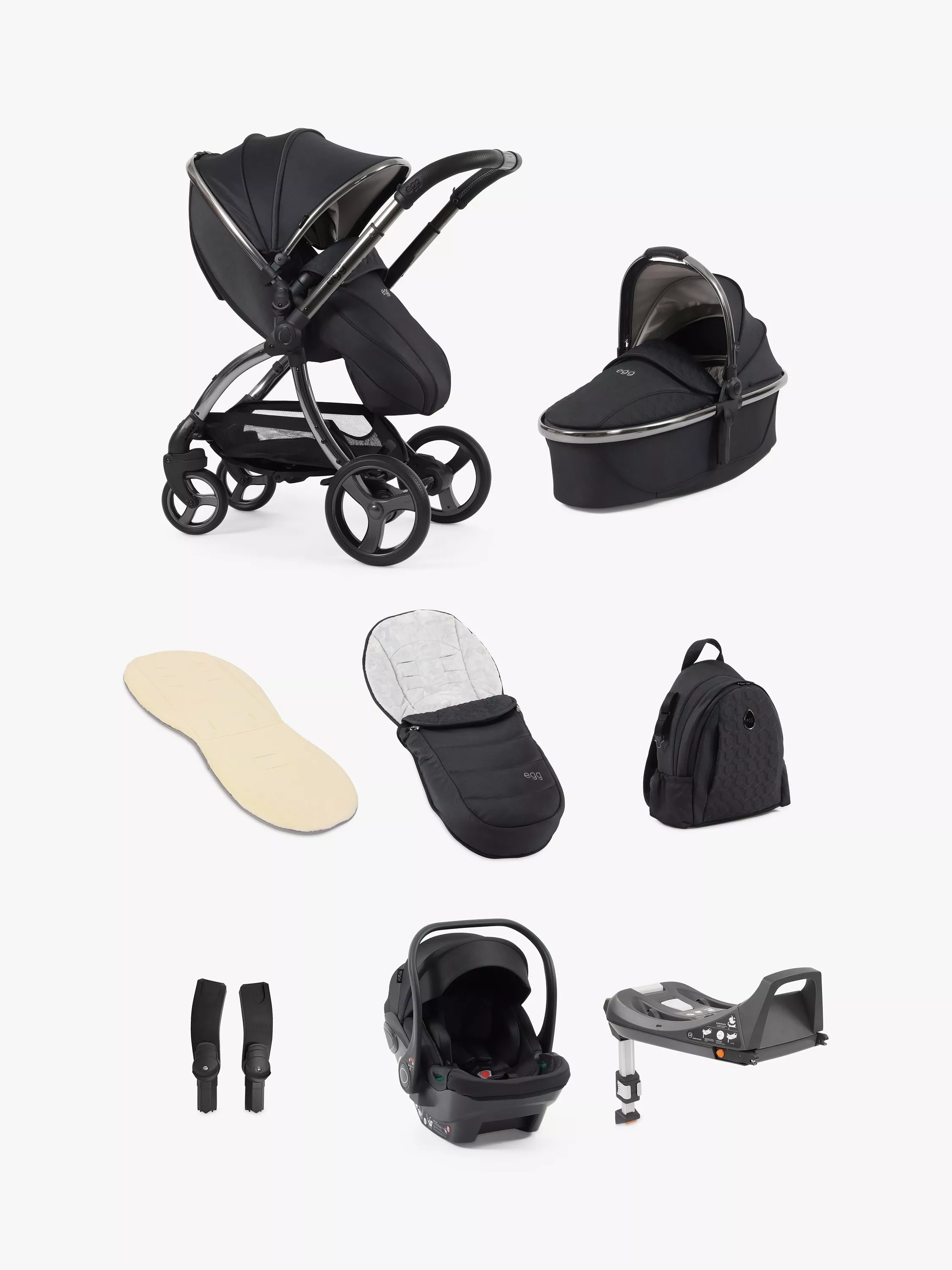 egg3 Pushchair, Carrycot & Accessories with Egg Shell Car Seat and Base Luxury Bundle, Carbonite