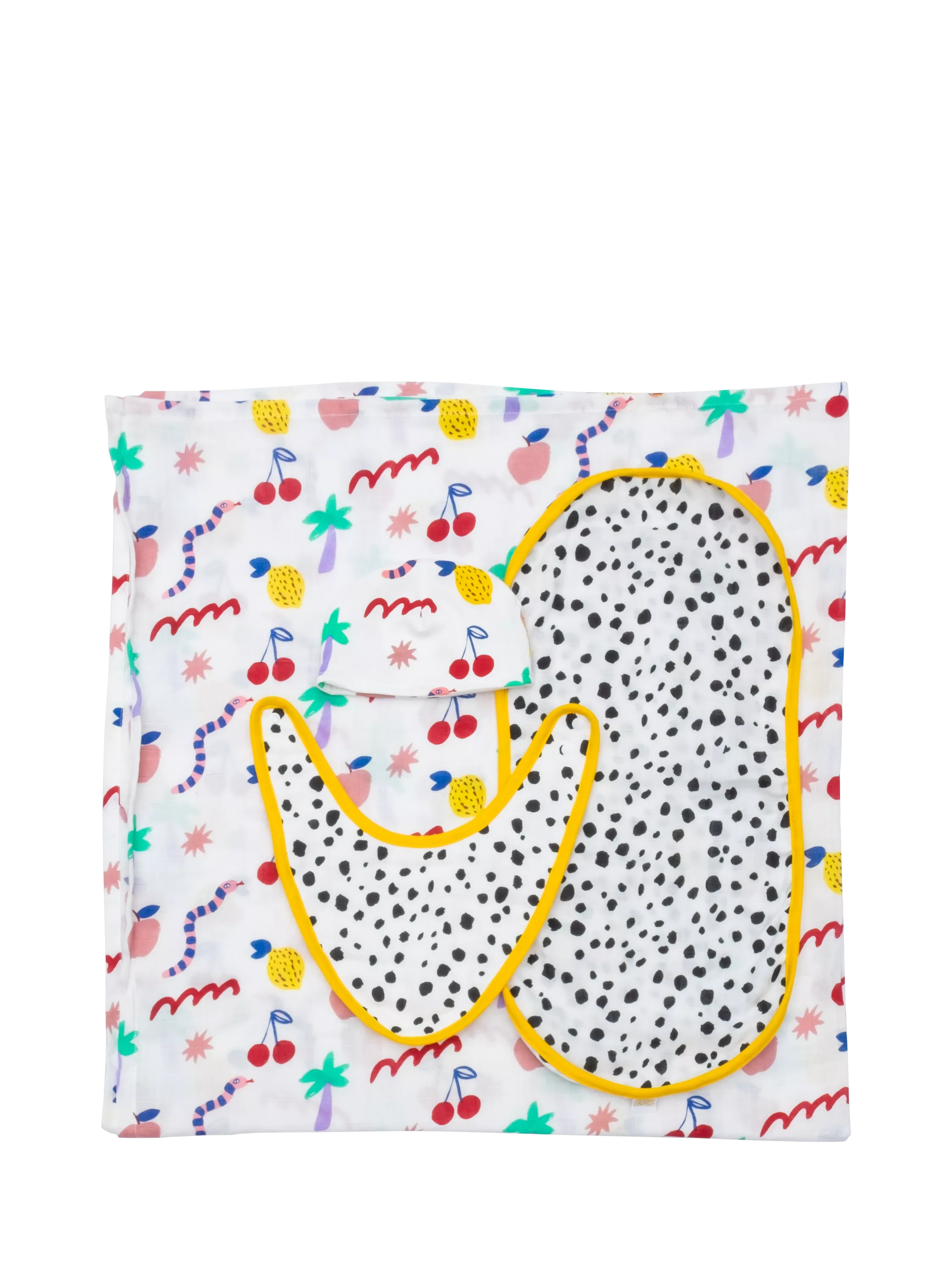 This baby gift set includes a muslin cloth, baby hat, baby bib and shoulder cloth in polka dot and bright printed patterns. Perfect for your new born, it's presented in a printed gift box.