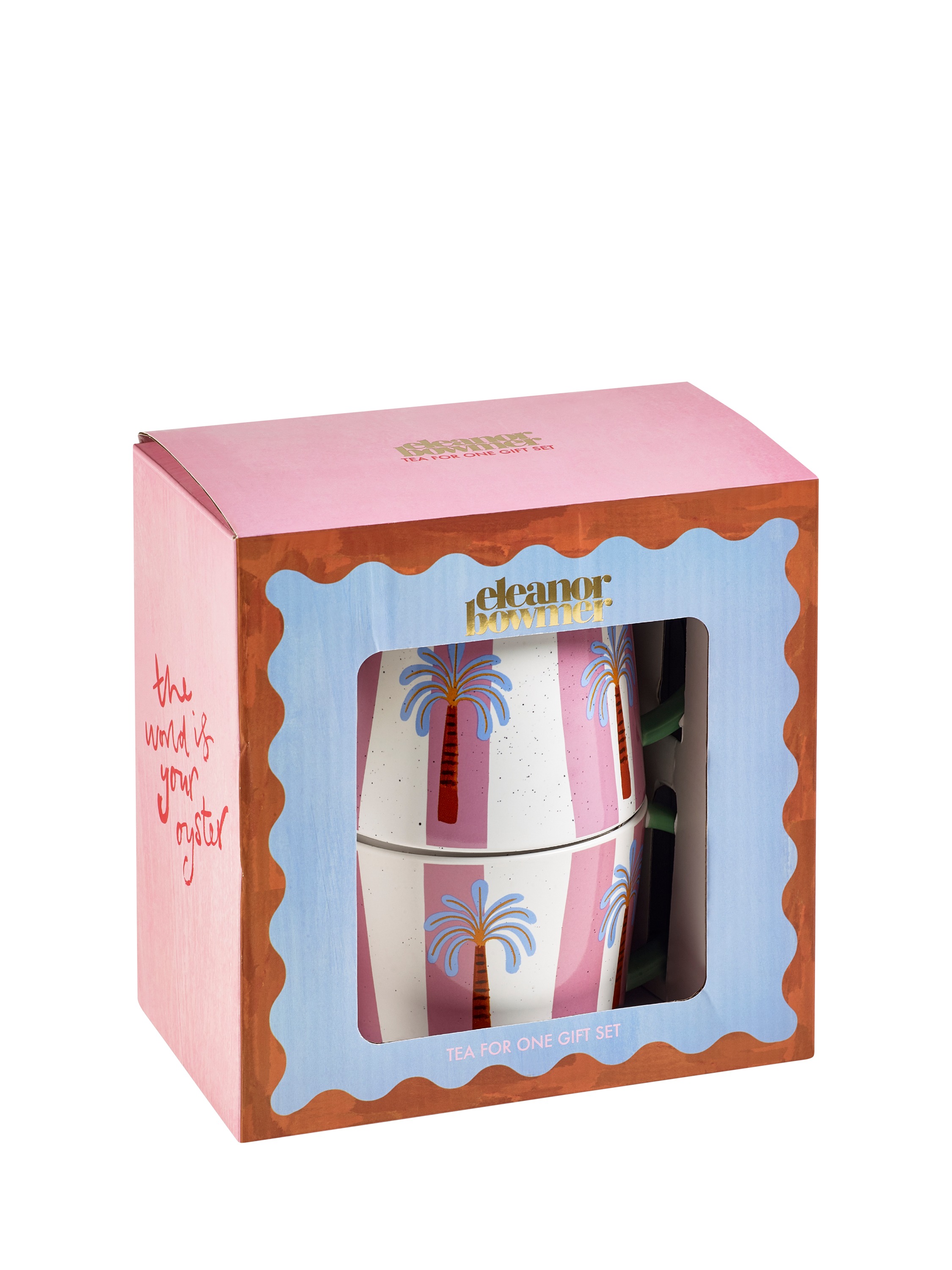 A real show stopper. Brighten up your table with the Eleanor Bowmer Electric Coast Tea For One, designed with Eleanor Bowmer's signature hand-illustrated icons and pink and white stripes. Crafted from stoneware and presented in a window box, it's a delightful addition to your kitchen or a thoughtful gift for someone special.