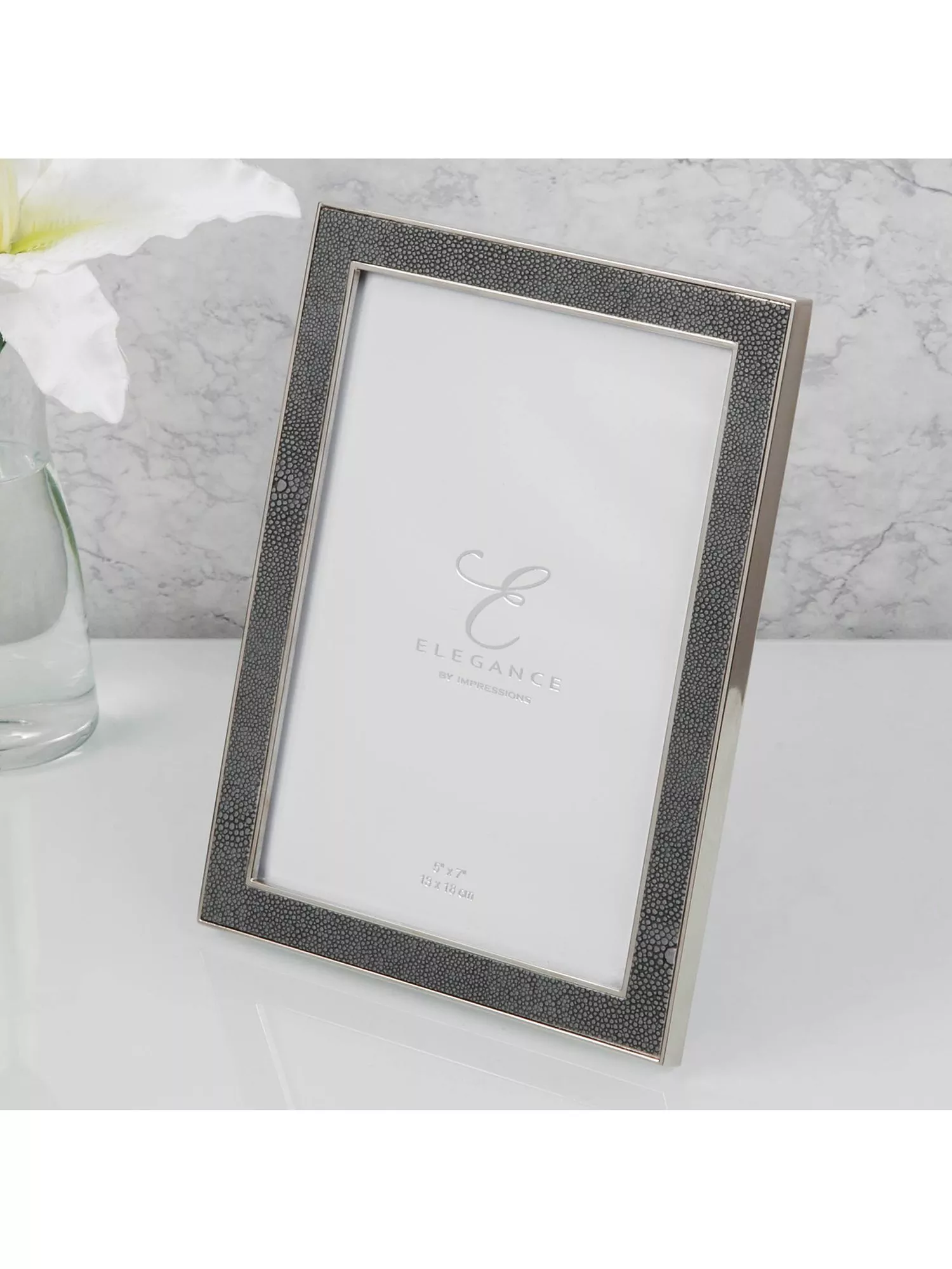 A gift-boxed nickel-plated photo frame with a grey faux-shagreen insert, from Elegance by Impressions. The frame can be displayed freestanding, vertically or horizontally, using the black velveteen standing strut. It's presented in a luxury signature Elegance gift box.