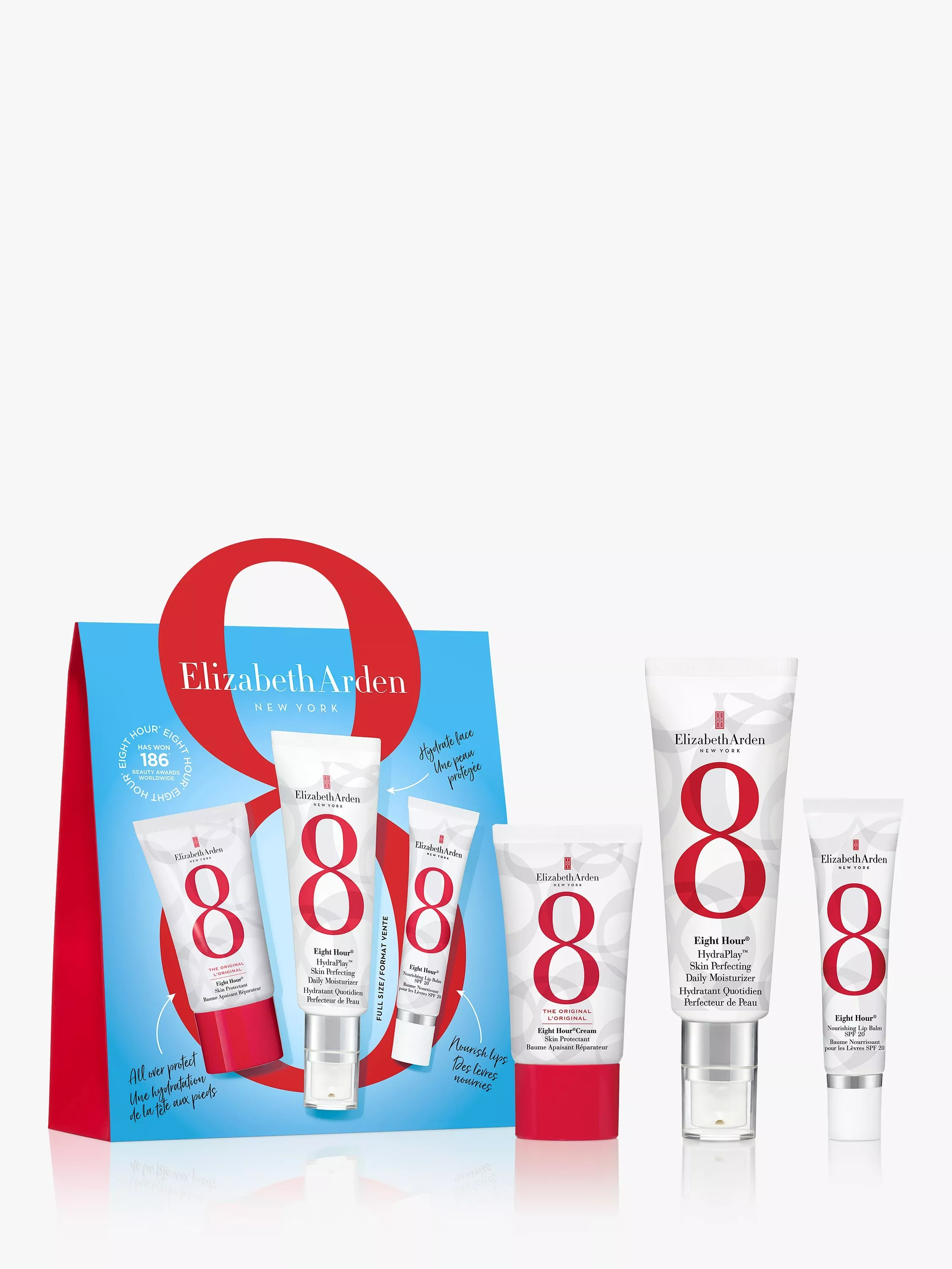 It’s flanked by our Eight Hour® Cream Skin Protectant, which isn’t your average multitasking beauty balm - it pampers, soothes, calms, highlights, adds a touch of glow to your cheeks and tames wild brows, and our award-winning Eight Hour® Nourishing Lip Balm SPF 20 – a daily treatment that hydrates and protects dry, flaky lips with vitamins, minerals and broad-spectrum sun protection.