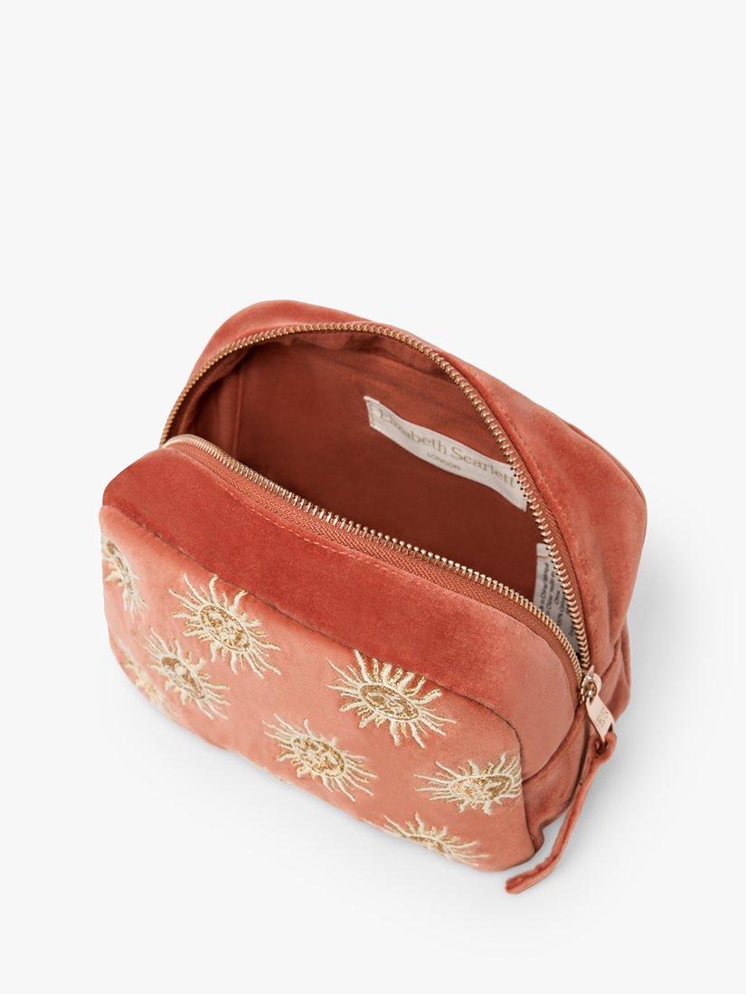 Elizabeth's hand-drawn sun motif is emblazoned onto a soft velvet base, with intricately embroidered gold and vanilla threads. She has depicted the sun with a human-like face, imagining our most powerful star as a character who radiates warmth and life.