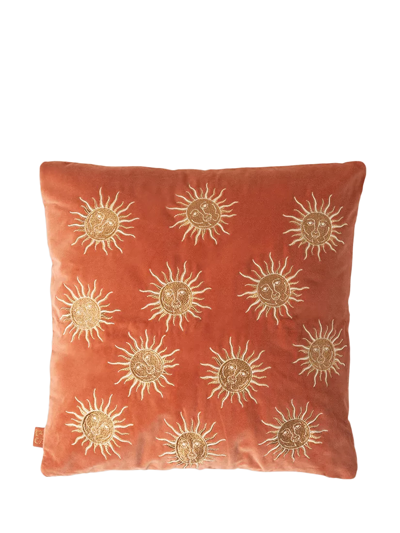 Elizabeth's hand-drawn sun motif is emblazoned onto a soft velvet base, with intricately embroidered threads. She has depicted the sun with a human-like face, imagining our most powerful star as a character who radiates warmth and life.