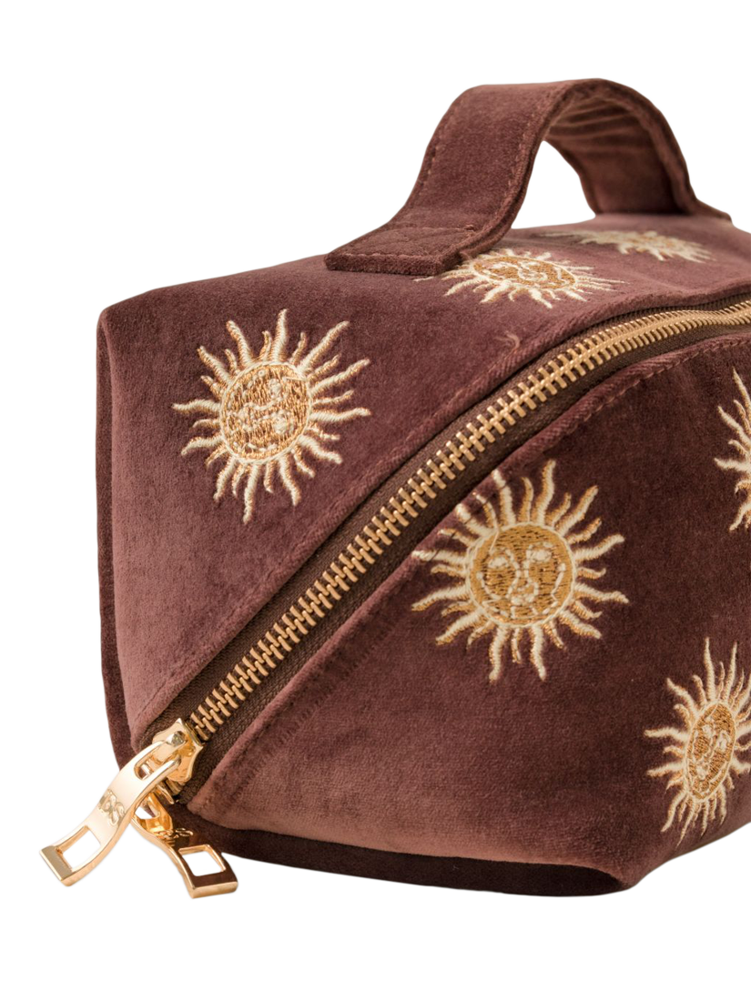 Elizabeth's hand-drawn sun motif is emblazoned onto a soft velvet base, with intricately embroidered threads. She has depicted the sun with a human-like face, imagining our most powerful star as a character who radiates warmth and life.