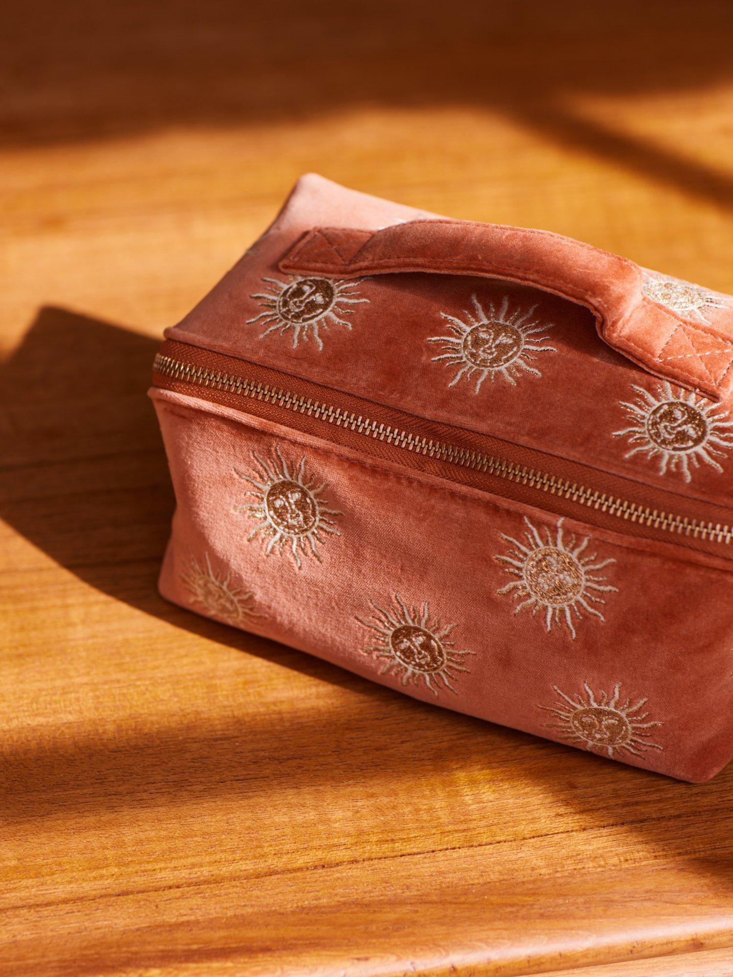 Elizabeth's hand-drawn sun motif is emblazoned onto a soft velvet base, with intricately embroidered gold and vanilla threads. She has depicted the sun with a human-like face, imagining our most powerful star as a character who radiates warmth and life.