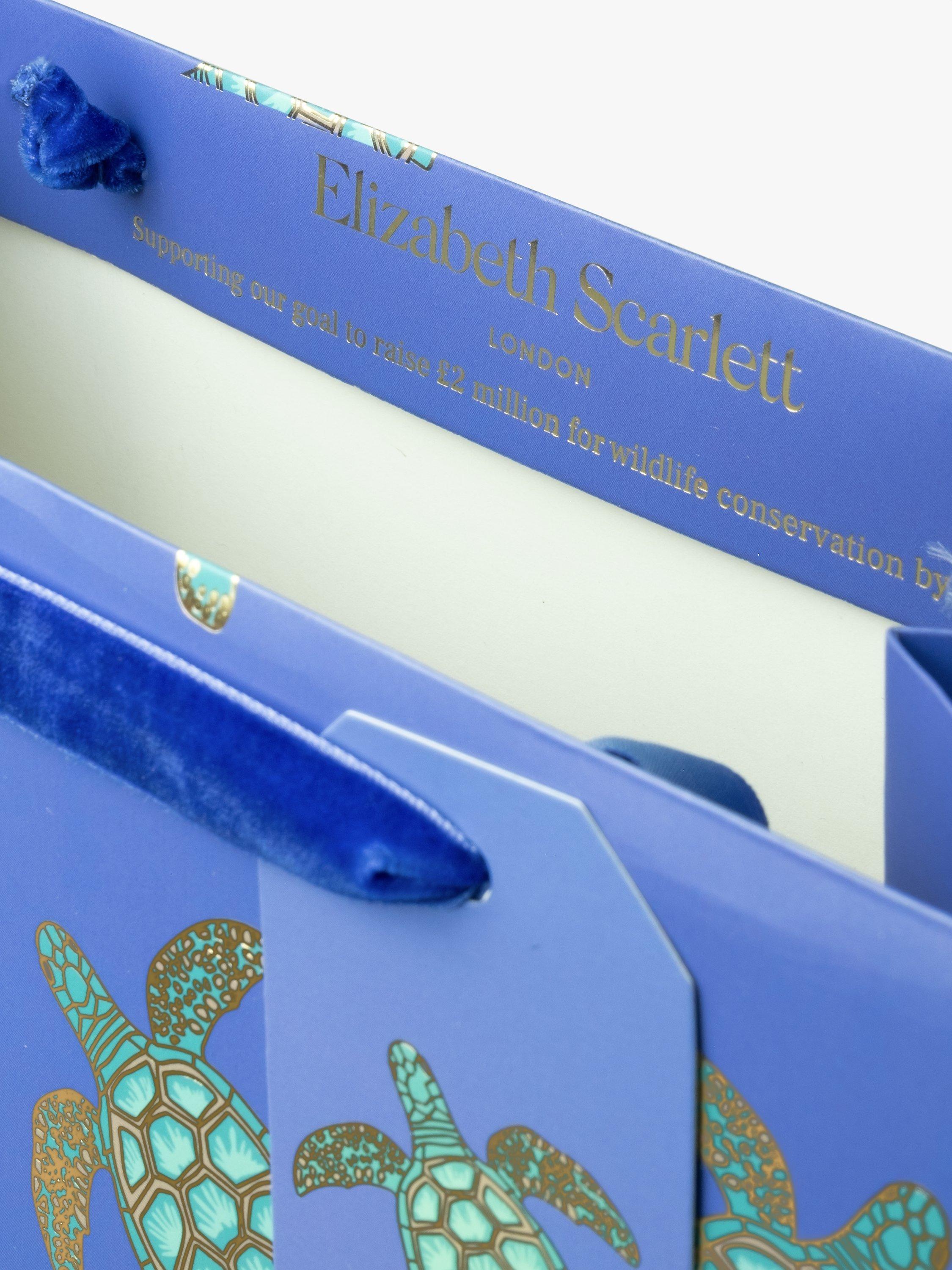 A printed gift bag with velvet ribbon handles and tag, designed by Elizabeth Scarlett.