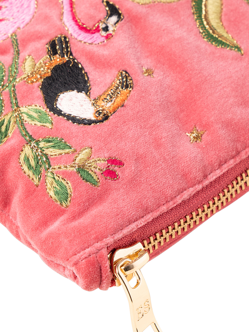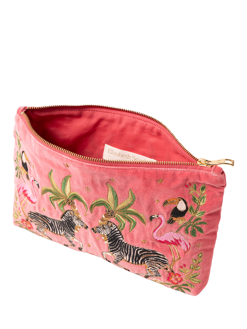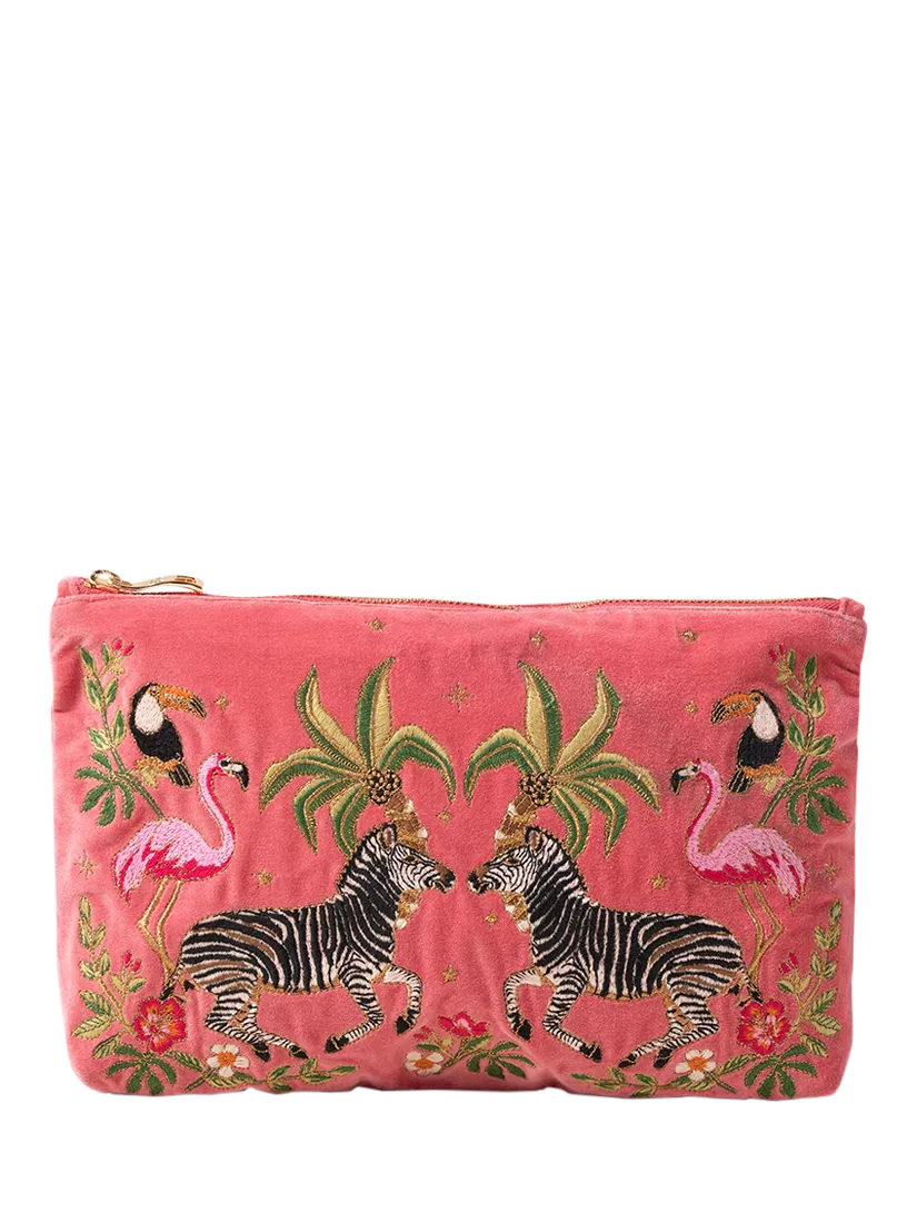 Framed by flamingos, toucans and palms, Elizabeth has painted these dancing zebras against a starry night sky in a dream-like mirage. Ideal for those who dream of exotic escapes, bringing joy to their rituals, use after use. Designed to make your life a little more organised and a lot more luxurious, this timeless Everyday Pouch features delicate embroidery on soft, durable bases. Ideally sized, it is perfect for storing your daily essentials, fitting in your handbag, or using as a clutch.