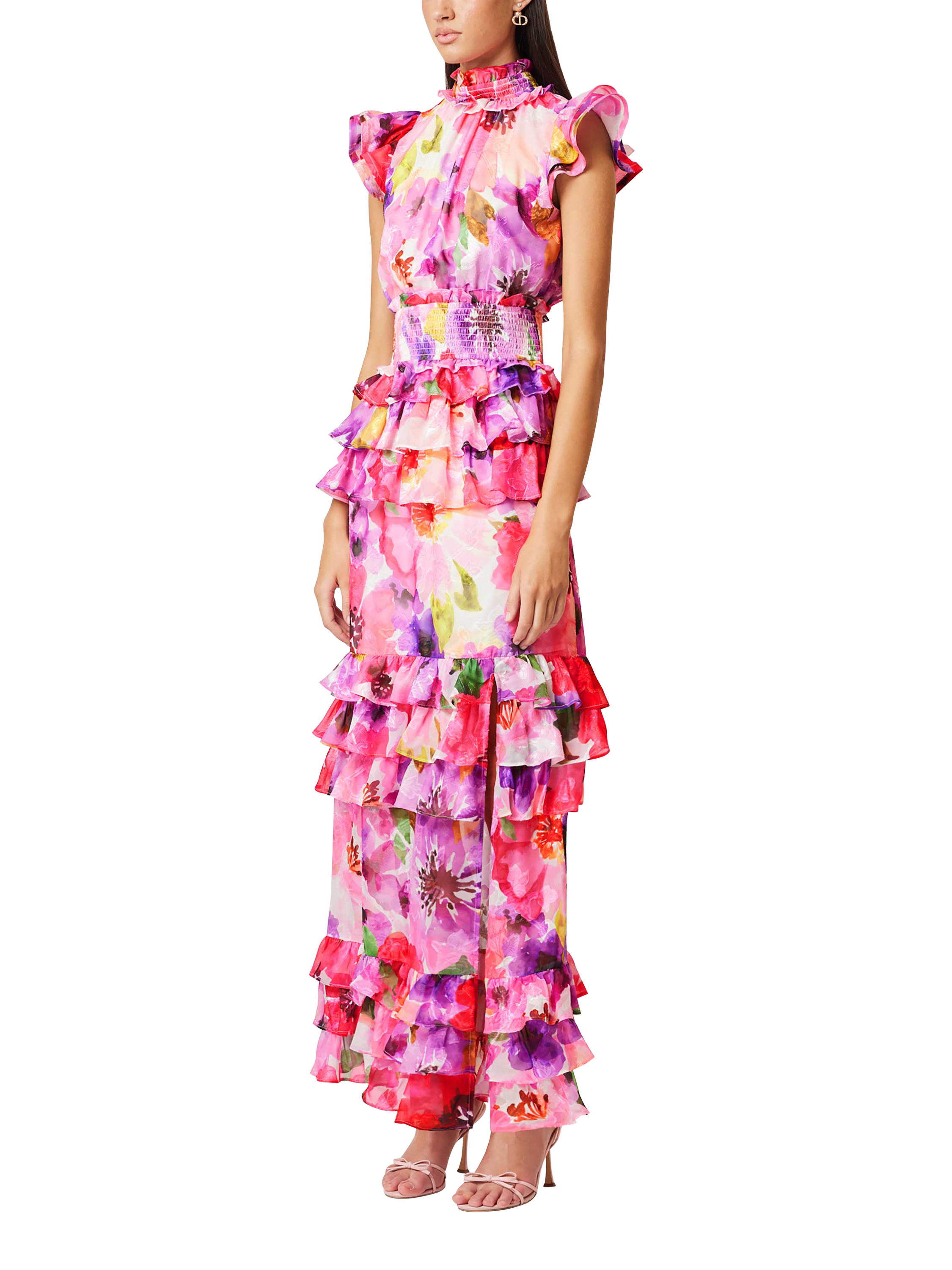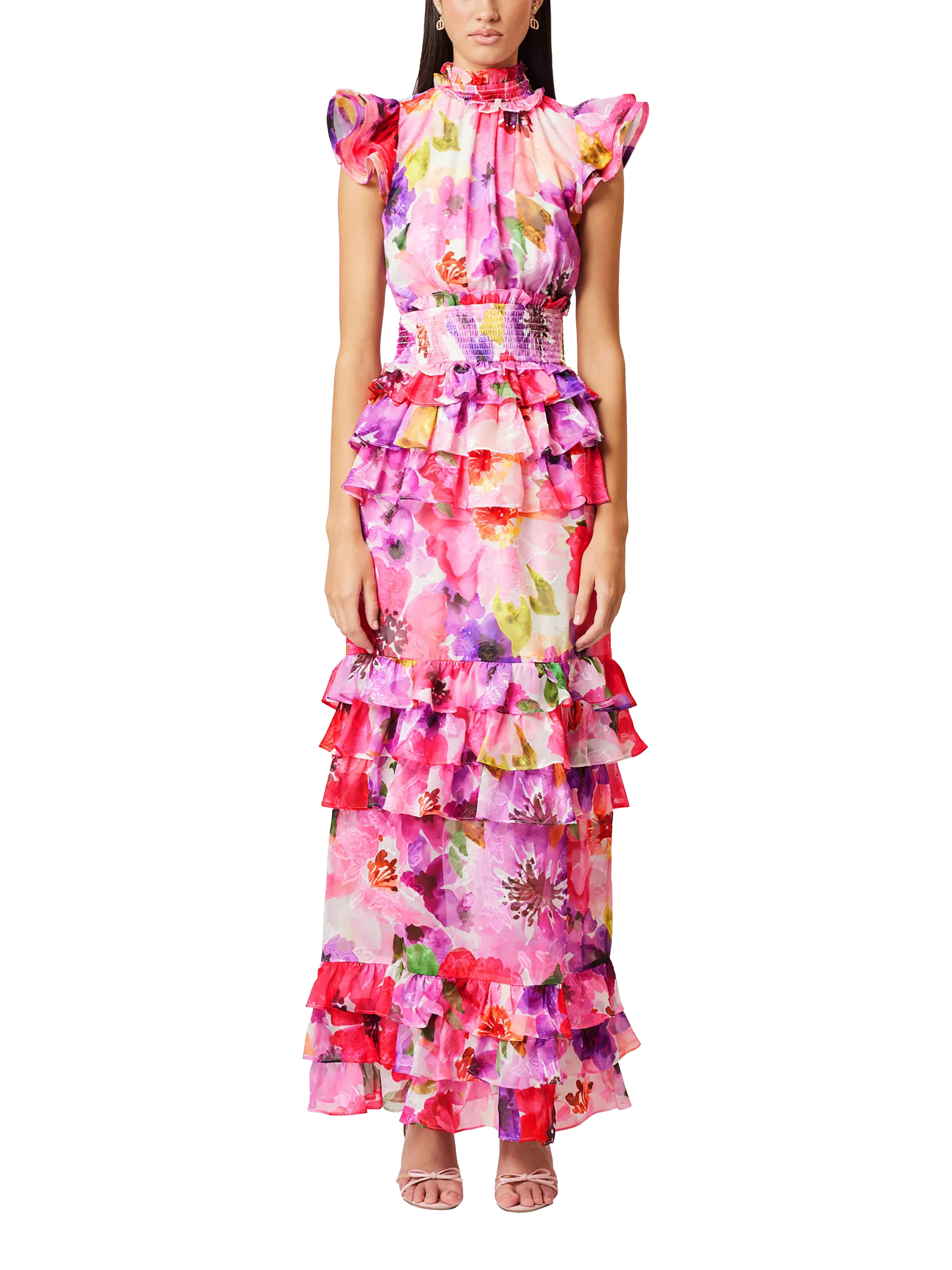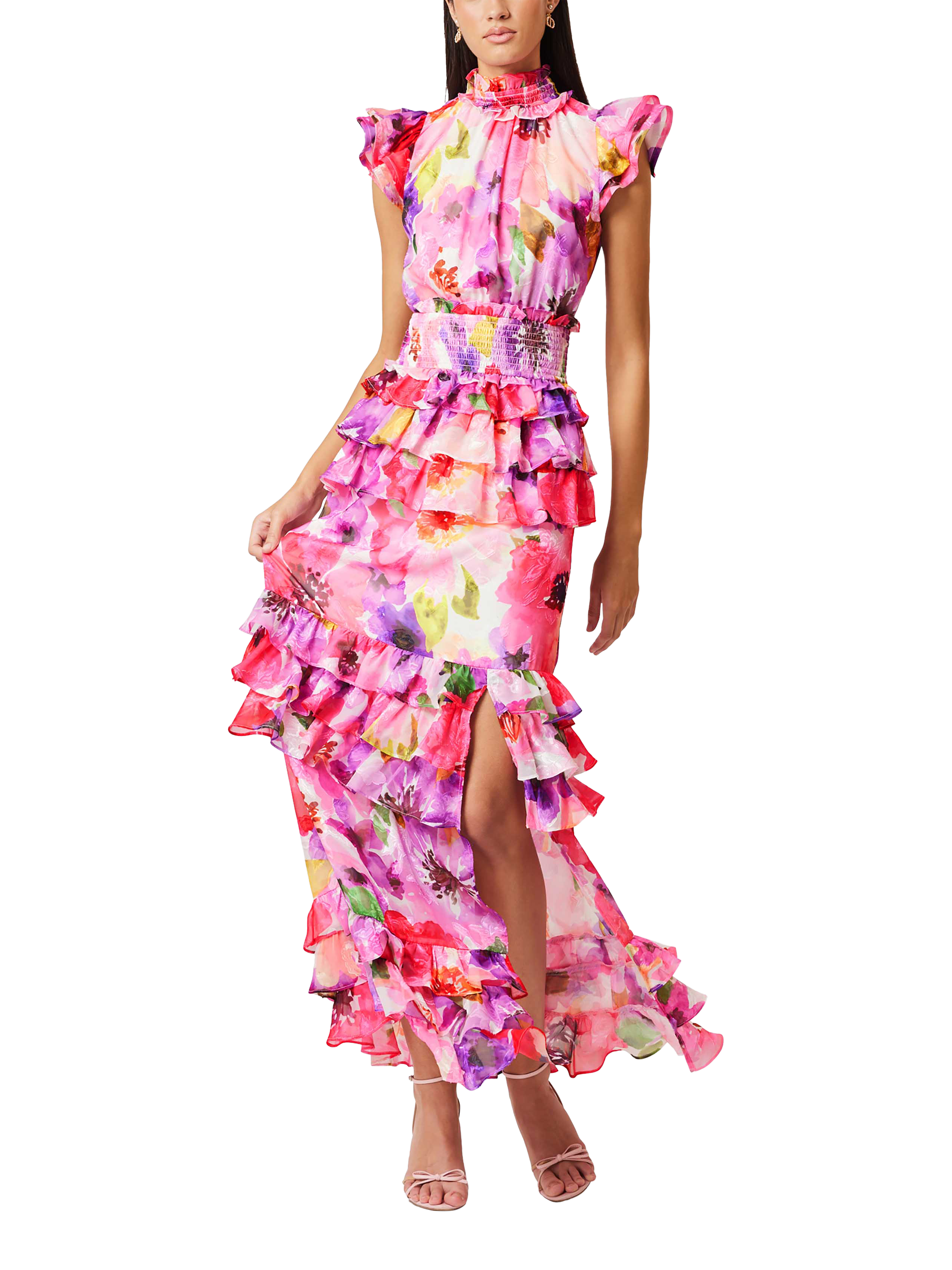 Designed with romantic ruffles from neckline to hem, this maxi dress from Elliatt is a stunning style in a bright floral print. Structured with a high neck and short sleeves, this style features comfortable shirring at the waist and falls to an A-line