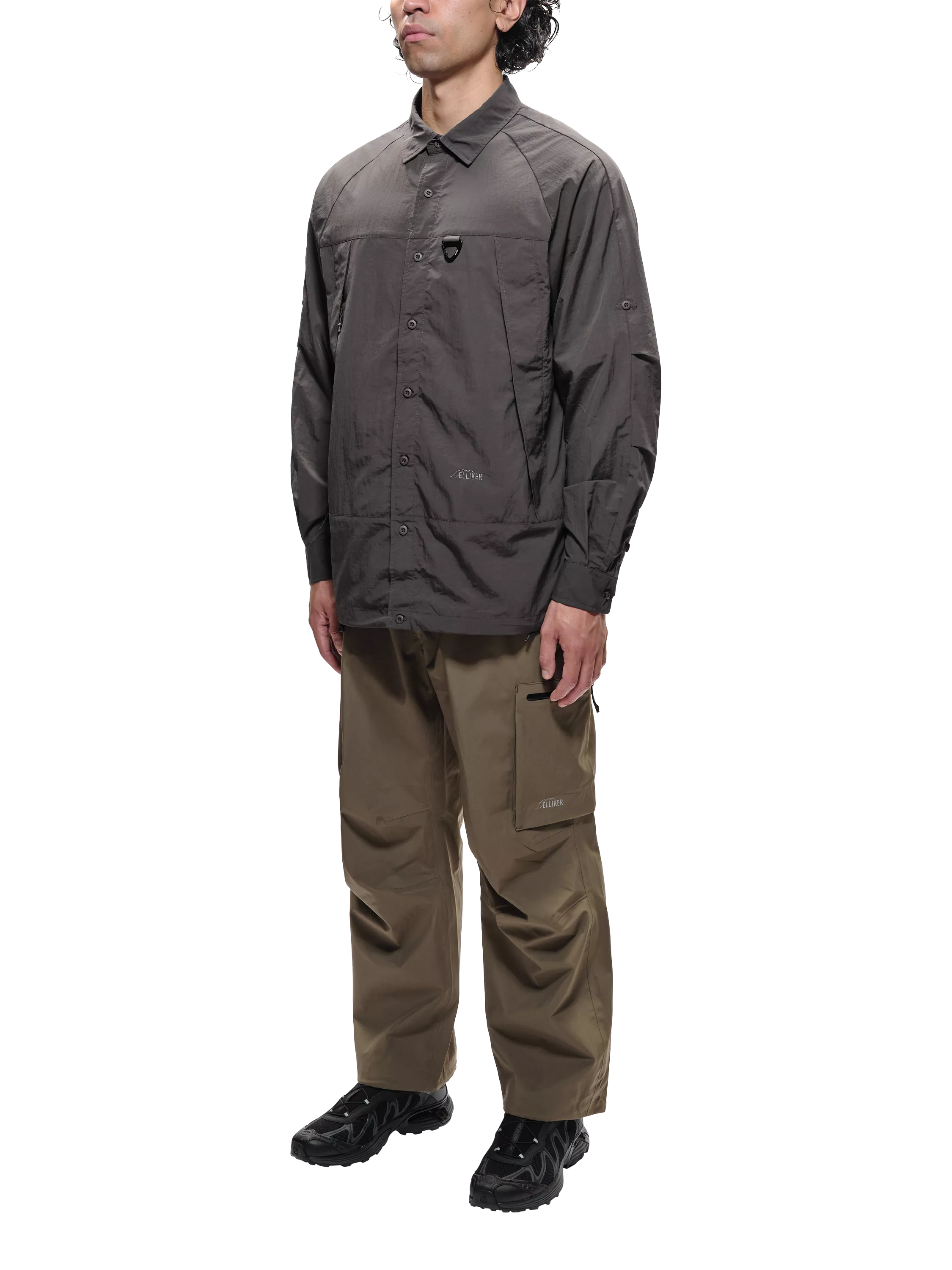 Engineered for everyday utility, the Craw Long Sleeve Zipper Tech Shirt blends functional detailing with clean design, built for life on the move. Constructed from lightweight 113 GSM 100% recycled nylon with a PFC/PFAS-free durable water repellent finish, it offers breathable protection and effortless layering across changing conditions. A relaxed fit with raglan sleeve construction allows for unrestricted movement, while roll-tab sleeves let you adapt on the go, roll them up and secure in place when the pace picks up. Two large zip-concealed front pockets provide secure, low-profile storage without bulk, ideal for stashing essentials close at hand. Finished with an adjustable waist puller, embroidered branding, and an ELLIKER carabiner clip, the Craw delivers considered performance with subtle technical flair, designed to transition seamlessly from trail to town. Features: