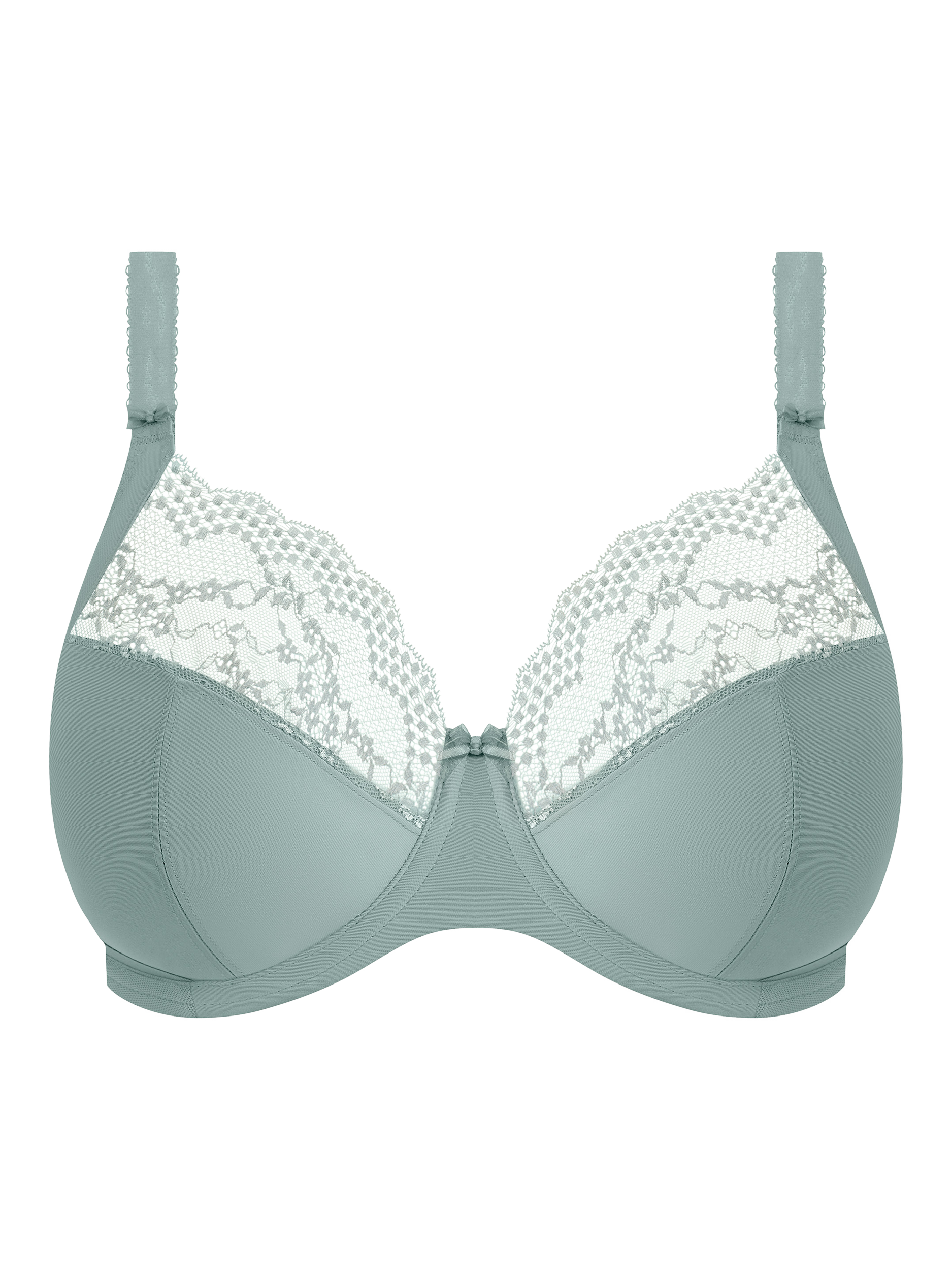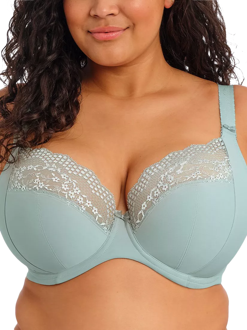 A banded underwire bra with side support. The low centre front gives a plunge effect without push-up. Powerful stretch lace top cups offer a rounded shape and a smooth finish when worn. The back is cut from printed stretch fabric overlaid onto powernet, to give anchorage and support. Fully enclosed, narrower underband elastic minimises rolling. 2-hook fastening on 36-44D, 36-42DD, 36-40E, 36-38F, 36FF, 34G, 32GG sizes. 3-hook fastening on all other sizes.