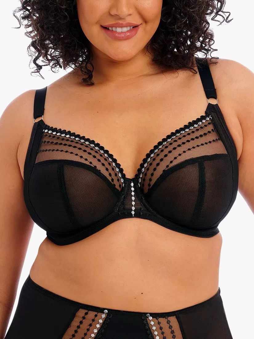 A new twist on Matilda featuring delicate embroidery sweeping across the sheer top cup. Plunge bra with a low centre front and revealing neckline without the pushup. A three-section cup with side panels provides forward shaping with good uplift and separation. Elasticated neck edge for ease of fit. Flexible back sweep for easy adjustment and sliding J-Hook adjuster for racerback conversion. Silver ring detail at apex.