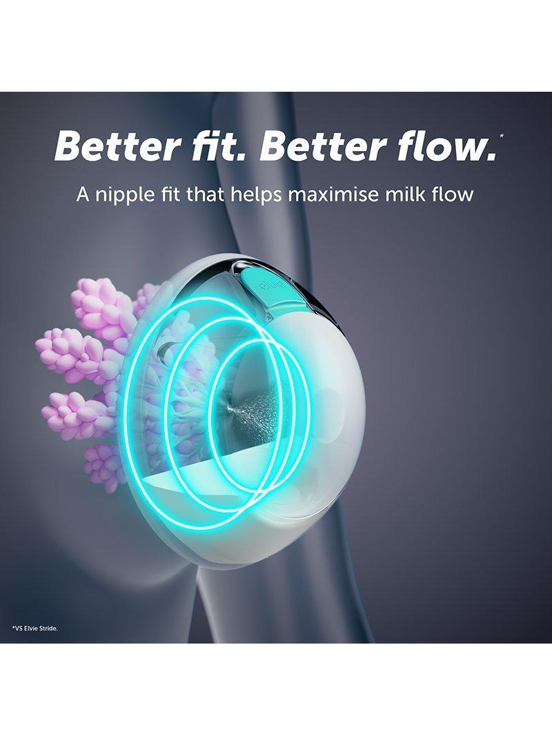 Better fit. Better flow* - Maximising your milk output isn’t just about power, it’s also about fit. That’s why Elvie Stride 2 is equipped with everything needed to cater to 99% of nipple sizes**, straight out the box.