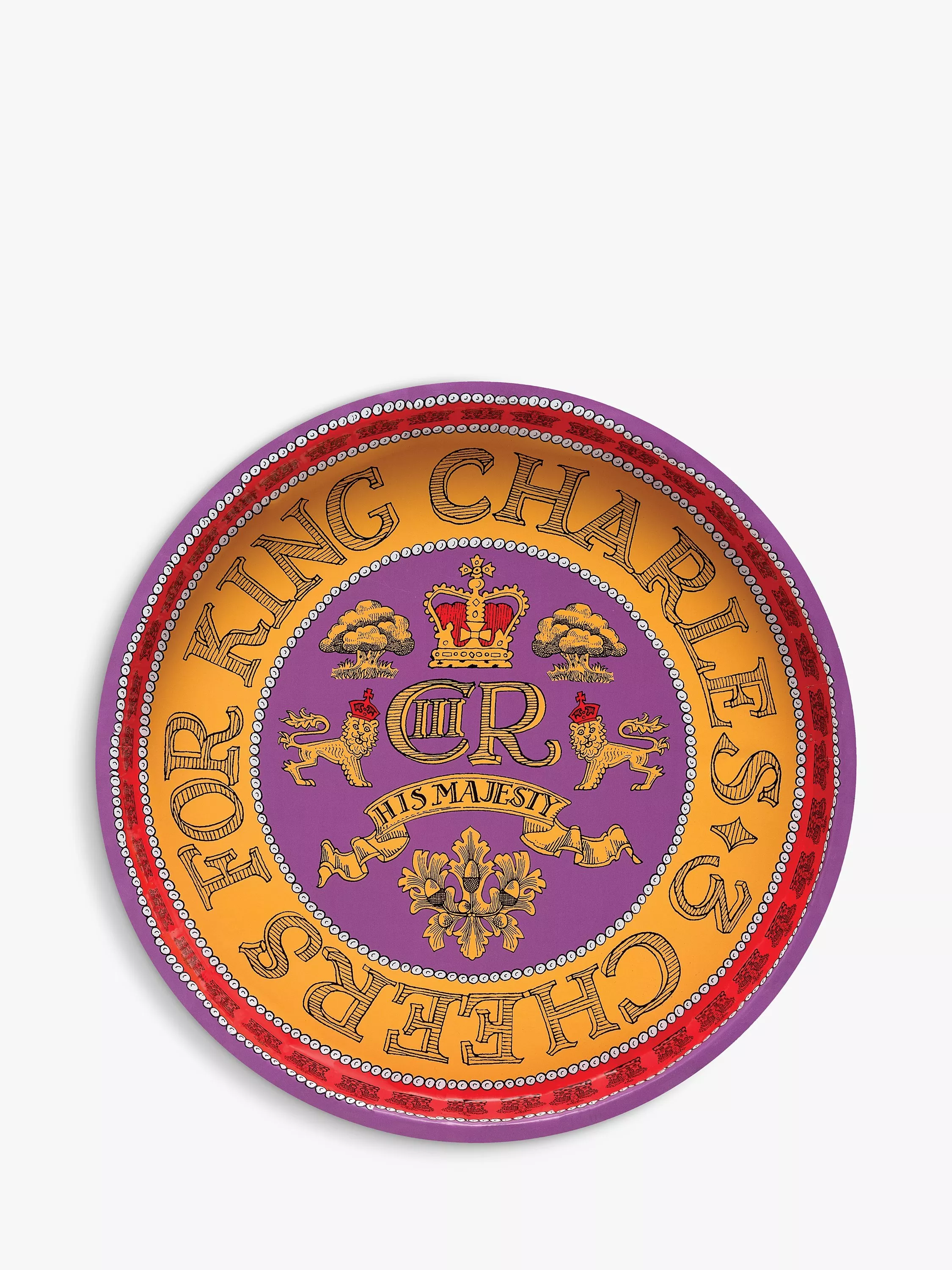 Emma Bridgewater'3 Cheers For King Charles' Coronation Round Steel Tray, 30cm, Purple/Gold