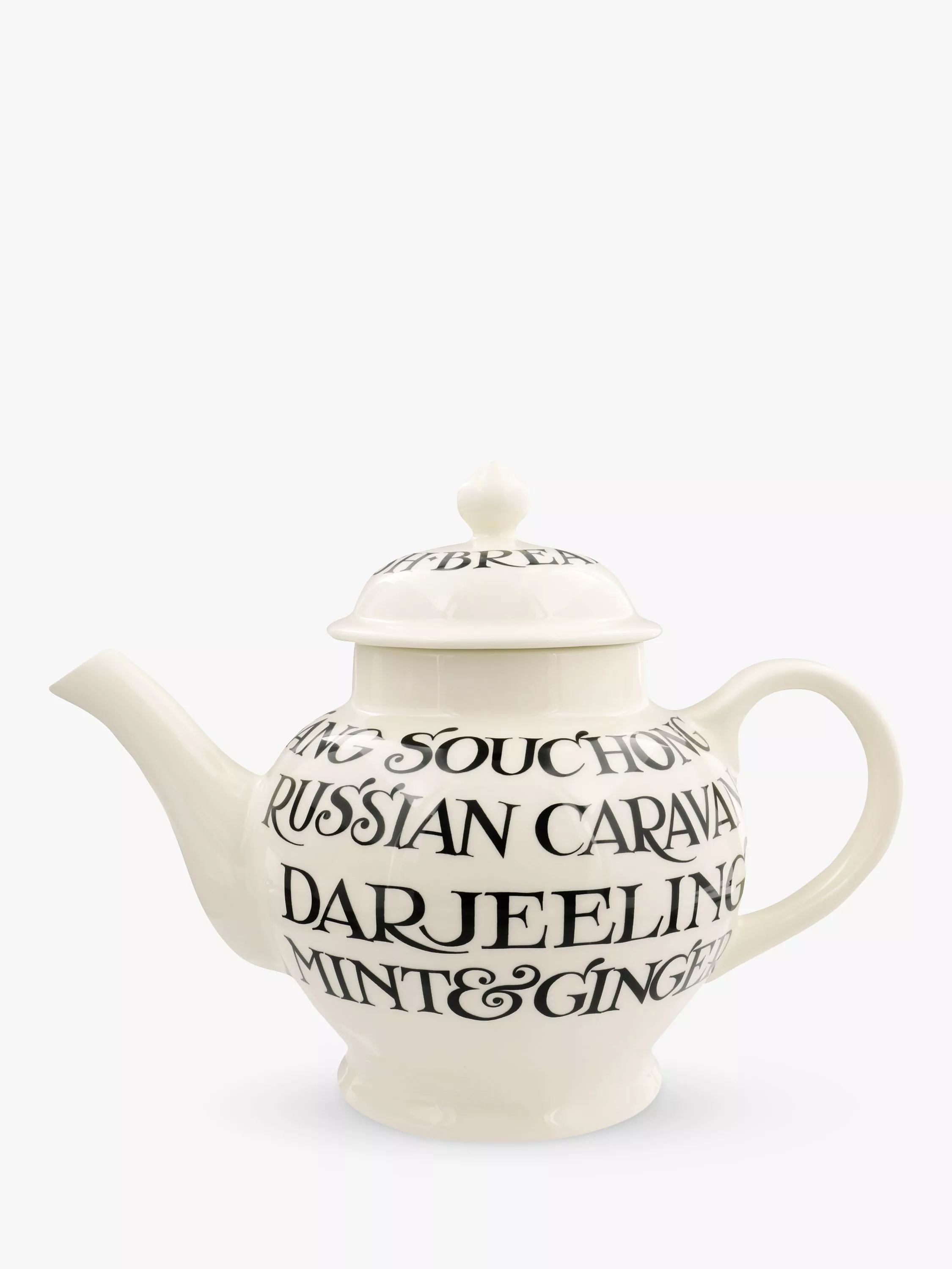 Decorated with the names of familiar and exotic types of tea from around the world, this four-mug teapot is from Emma Bridgewater's Black Toast range. With its bold hand-painted designs, the Black Toast range of earthenware tells you exactly what each piece is for. It's smart, playful and quintessentially English.