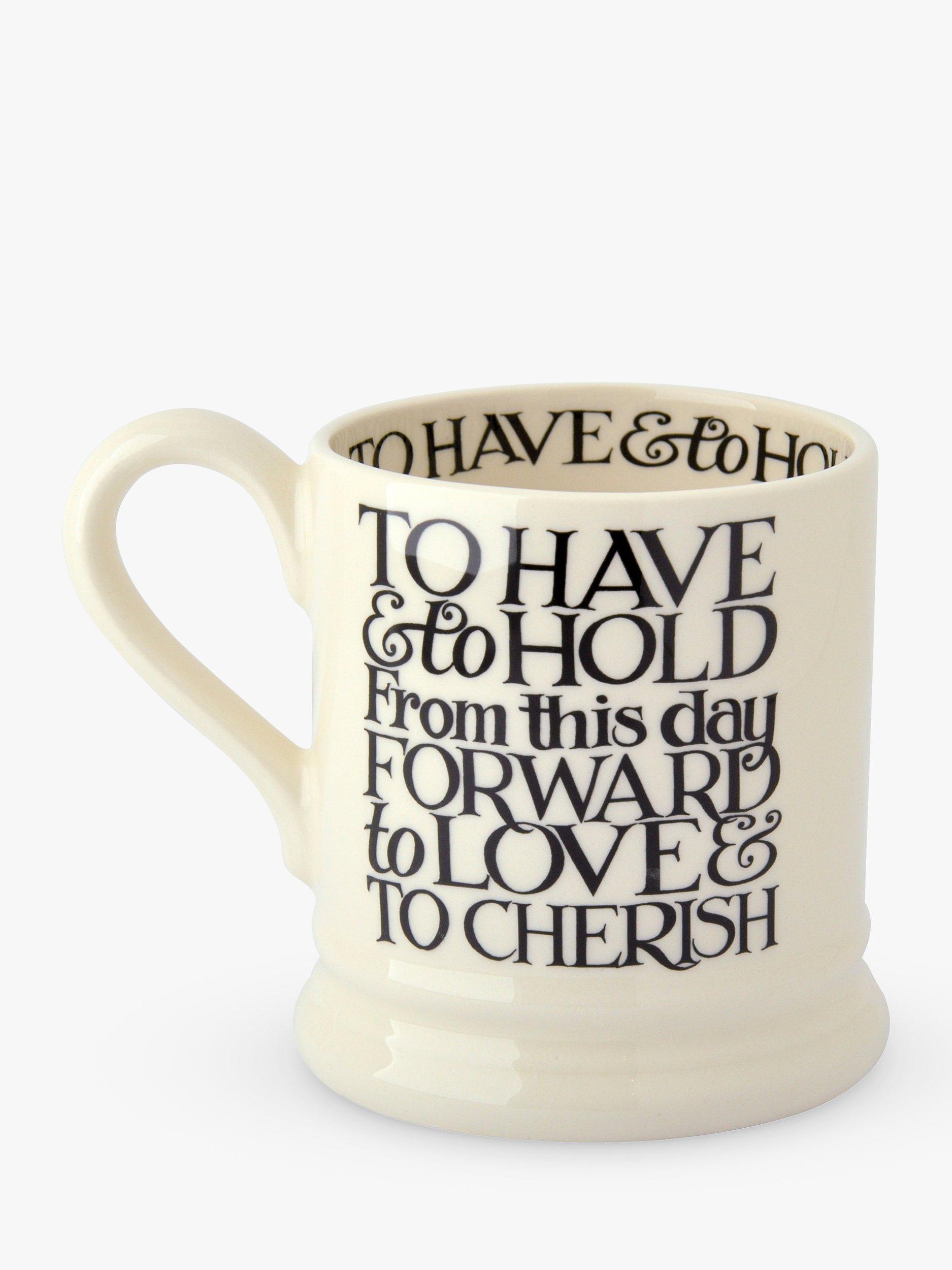 Typography on the back reads: 'TO HAVE & to HOLD From this day FORWARD to LOVE & TO CHERISH'. Inside reads: 'TO HAVE & to HOLD, LOVE & to CHERISH'. Made of earthenware, the mugs are dishwasher safe for everyday use.
