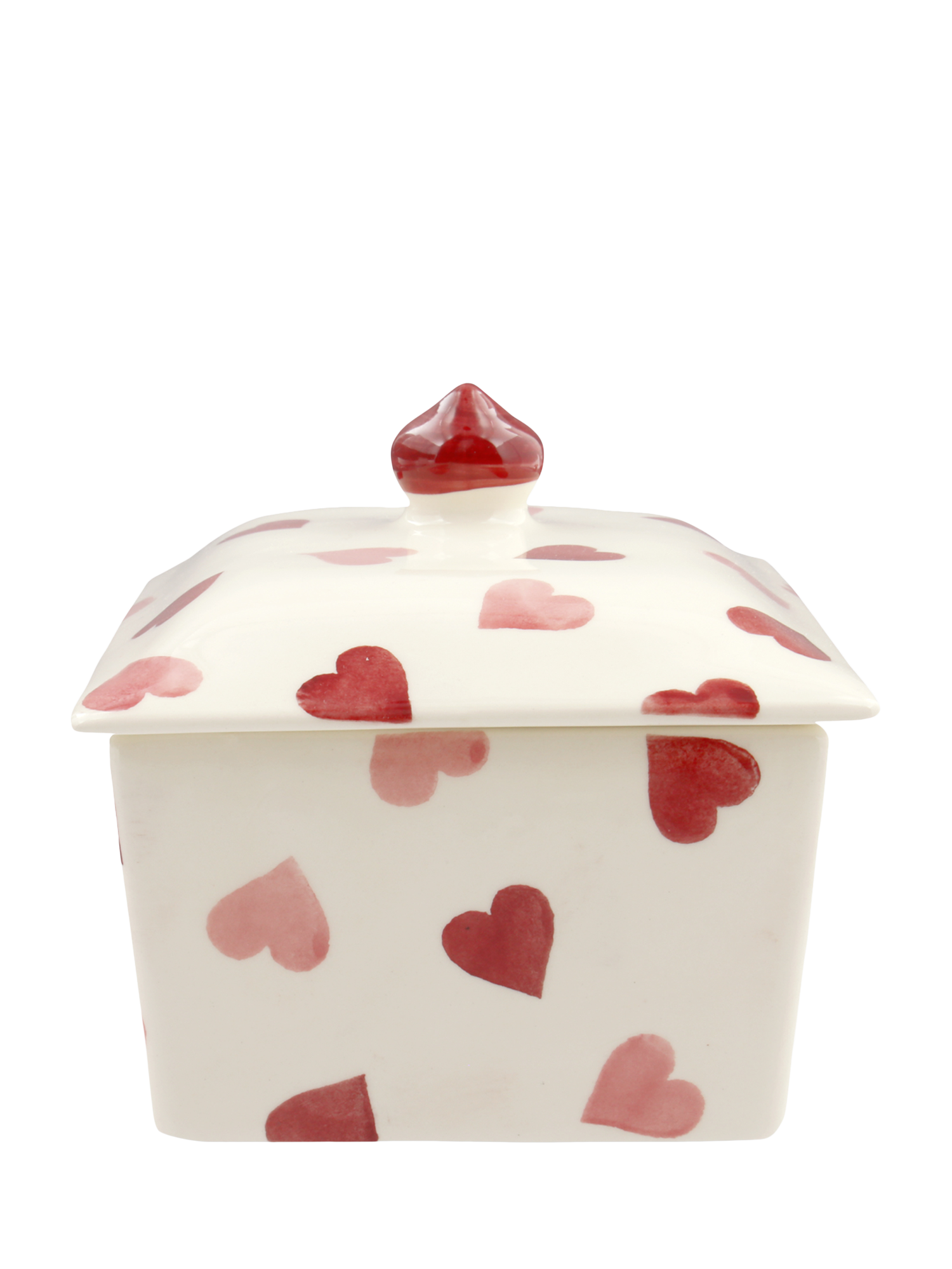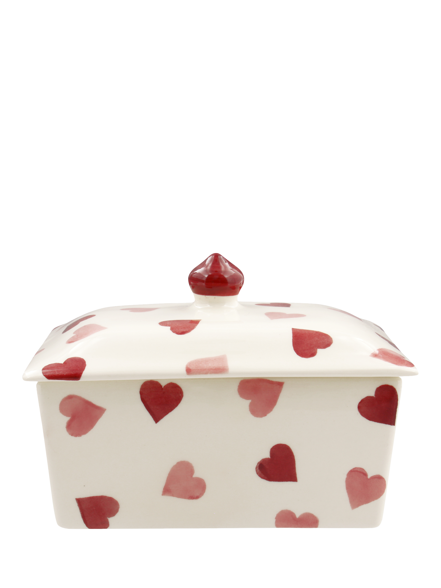 You'll fall in love with this charming little butter dish. Maybe it's the pretty sponged pink hearts overlaying its cream shell? Maybe it's the classic shape to keep your butter just right, at room temperature?