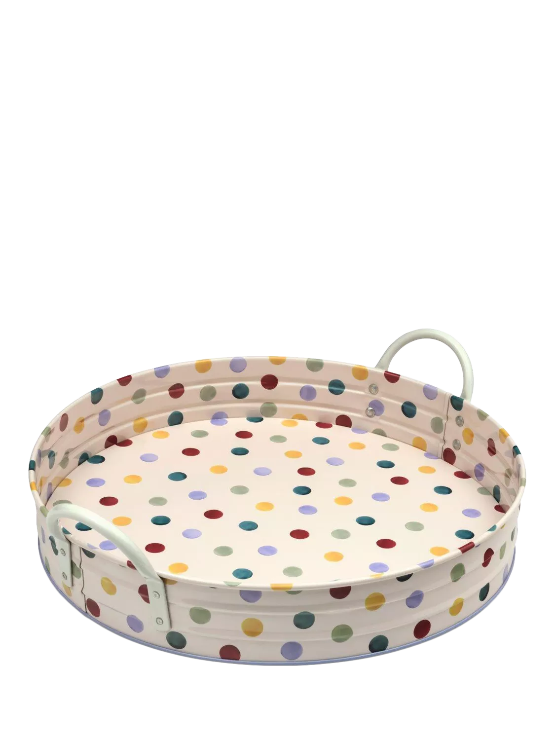 Round steel tray in Emma Bridgewater's classic and colourful Polka Dot design. Two large handles make it easy to carry.